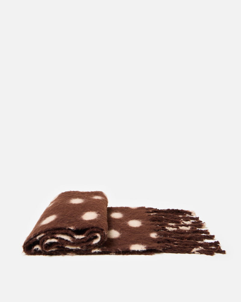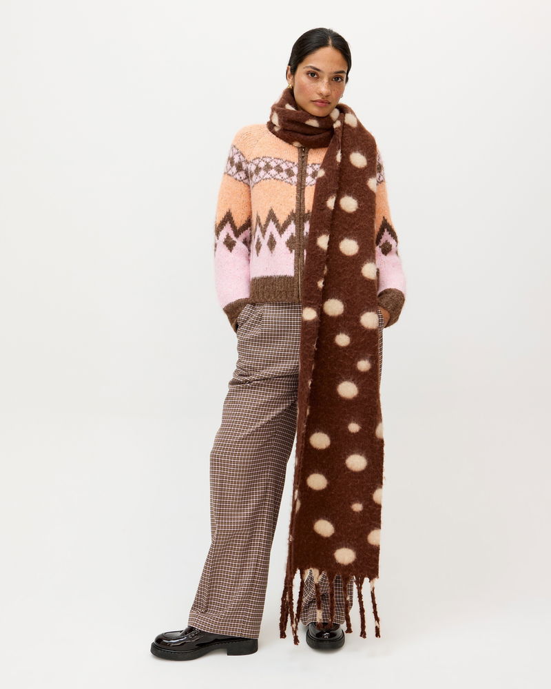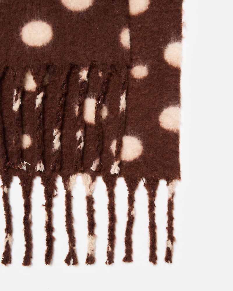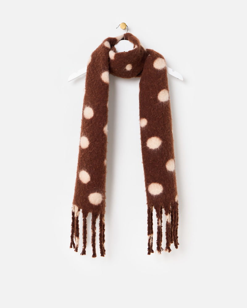 Designed in a chocolate brown and cream polka dot pattern, our knitted scarf offers just the right amount of warmth for chilly days. Finished with a classic tassel trim, drape it over your outfit or wrap it snugly for extra cosy comfort.