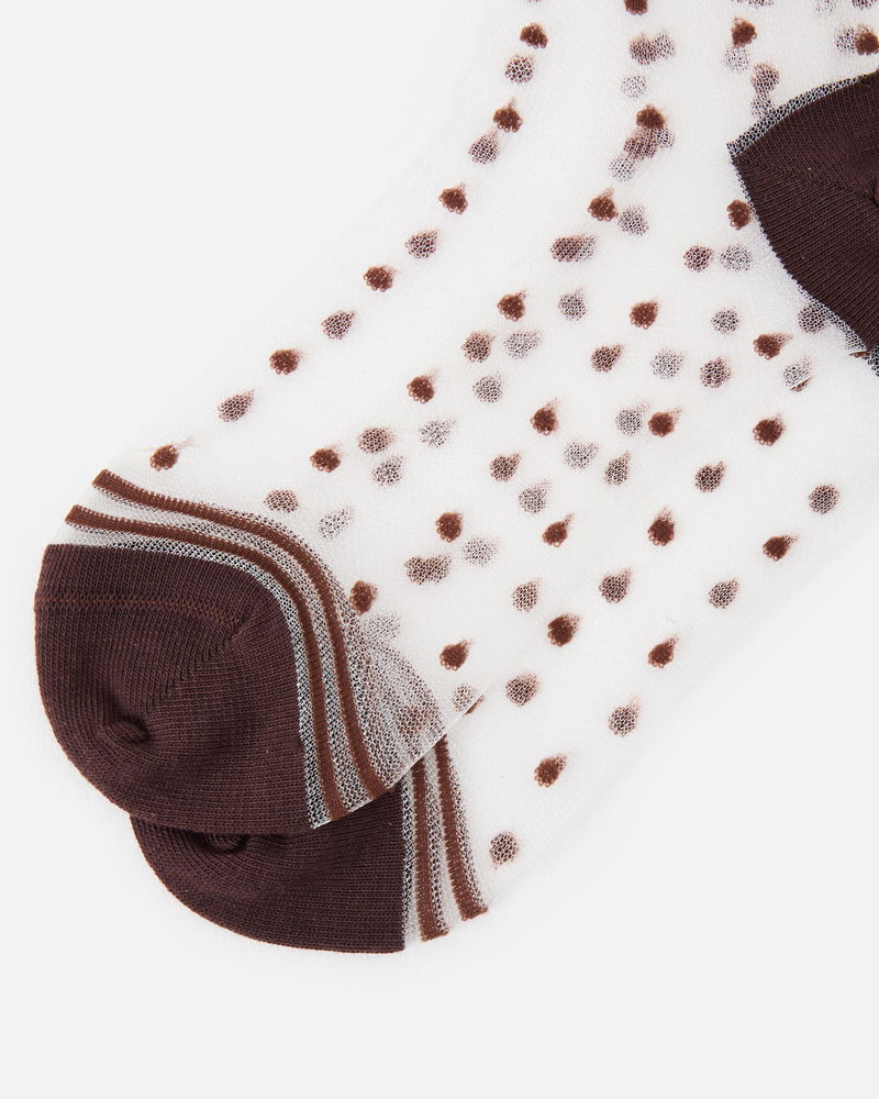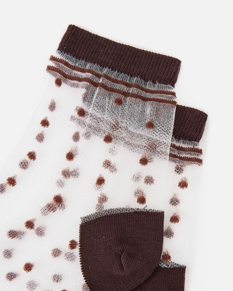 Because everyday basics don't have to be basic. Meet our sheer ankle socks knitted with a chocolate brown polka dot pattern, featuring striped trims and solid brown toes and heels.