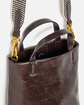 Compact cream crossbody bag with a monochrome geometric woven strap, fold over fastening and exterior zipped pocket.