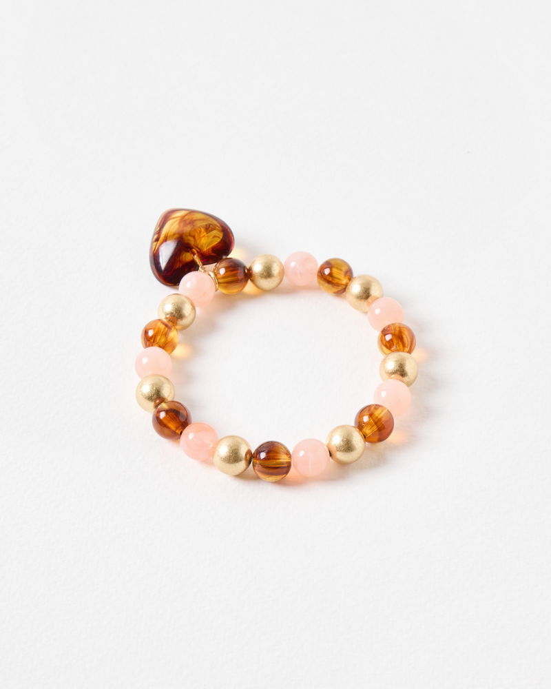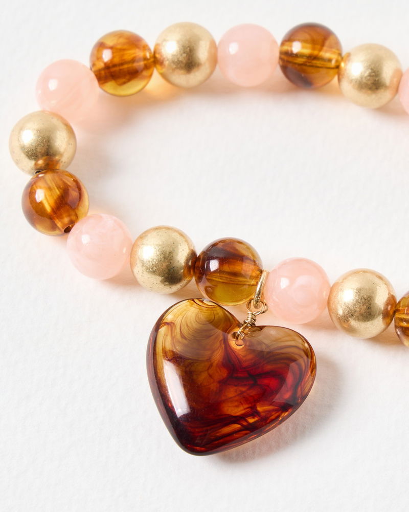 Made with chunky pink, brown and gold beads, this statement bracelet has a large heart pendant made form tonal brown resin. Wear solo or with the matching necklace for a co-ordinated look.