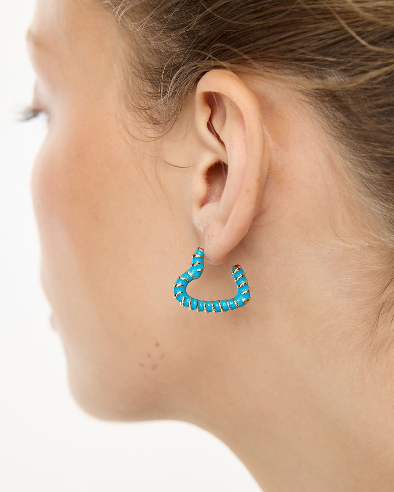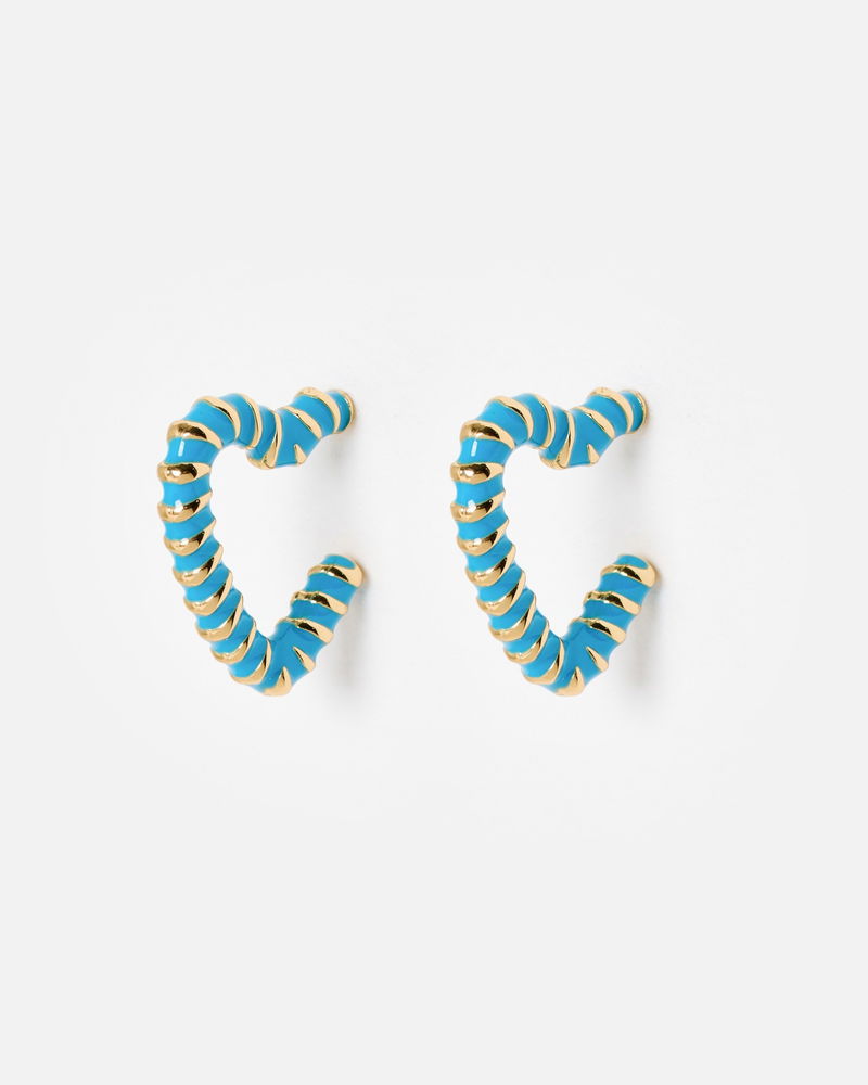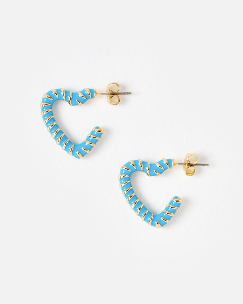 Statement hoop earrings designed in an oversized heart shape. We've used bright blue enamel and a shiny gold stripe to add impact, as well as a butterfly back for easy fastening.