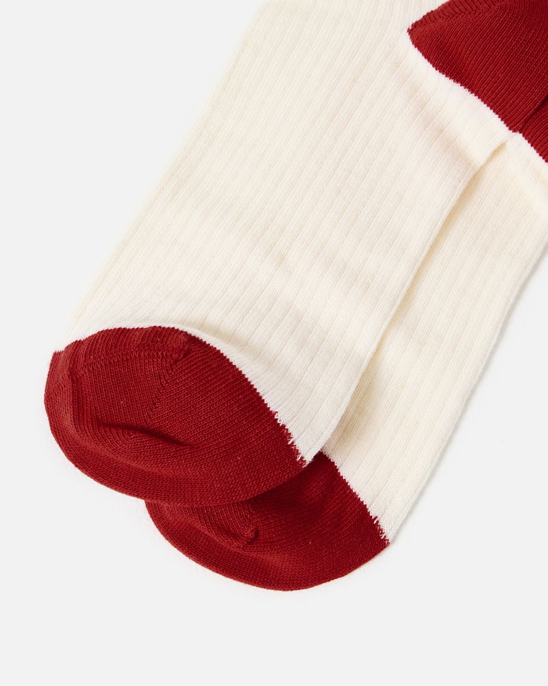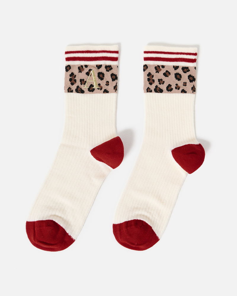 Looking to add a touch of athleisure to your outfit? Make it personal with the alphabet cream sporty ankle socks knitted in a ribbed pattern with burgundy toes, heels and striped trims.