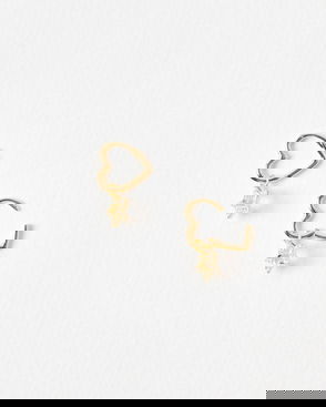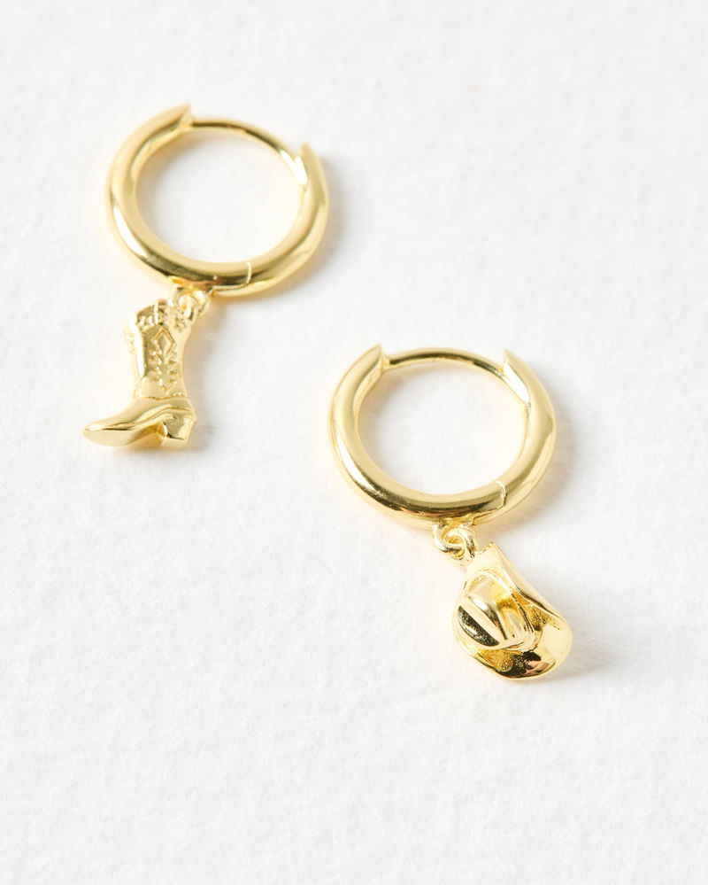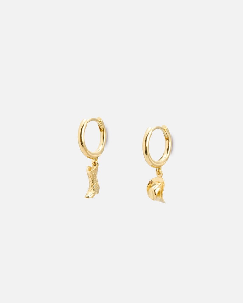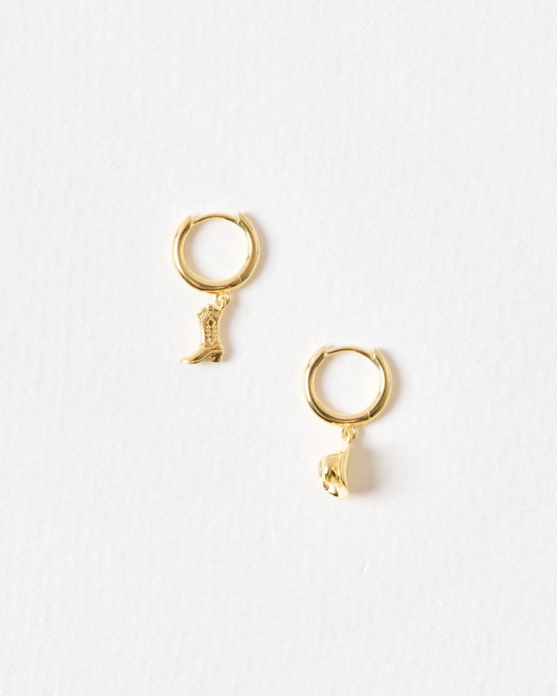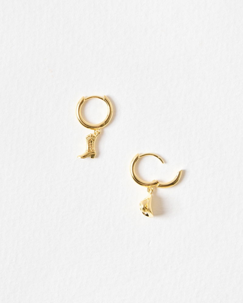 A pair of huggie hoop earrings finished in gold plate suspending a small cowboy hat and boot charm in a mismatched design for a touch of Wild Western style.