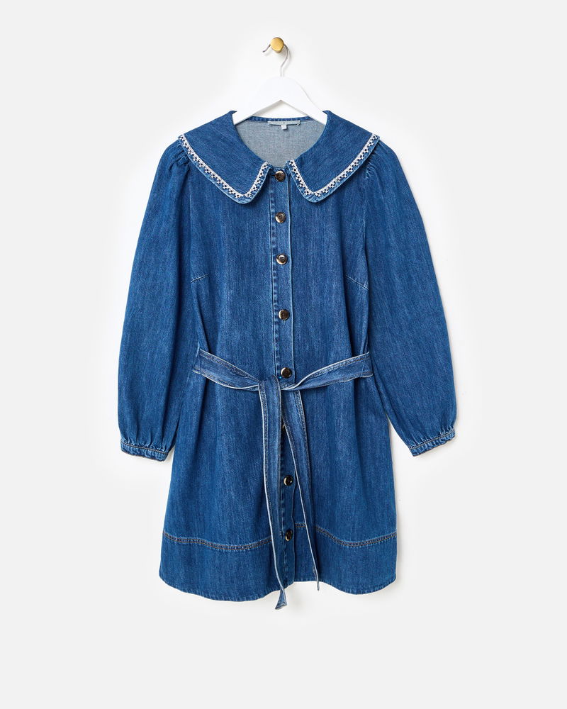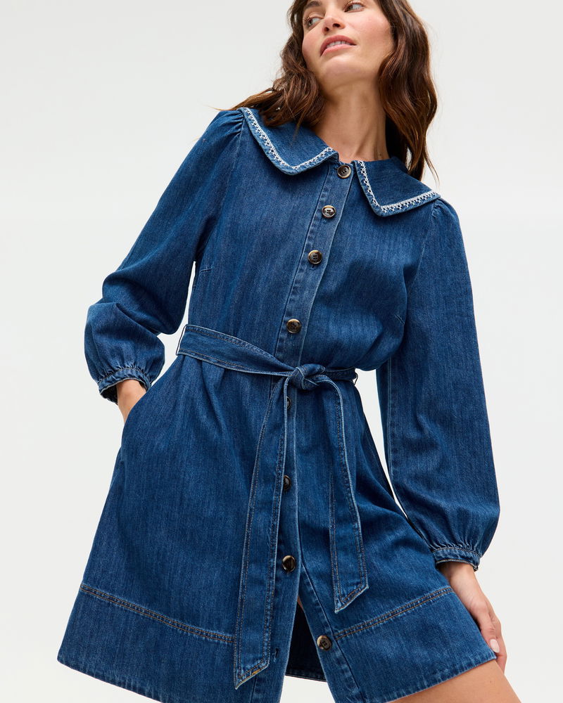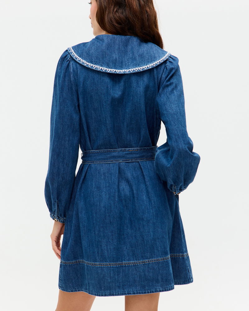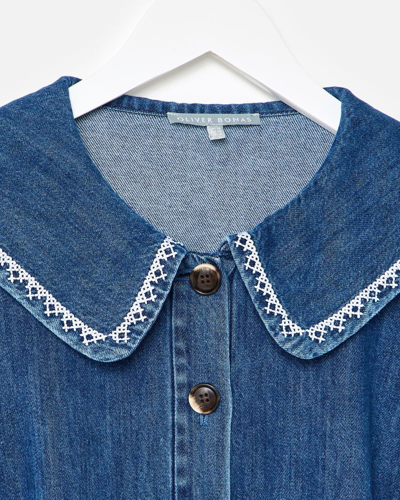 Dark Blue Denim Embroidered Collar Mini Shirt Dress