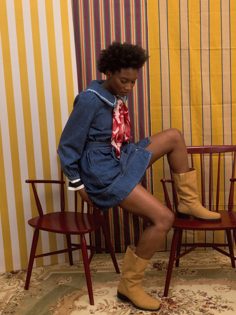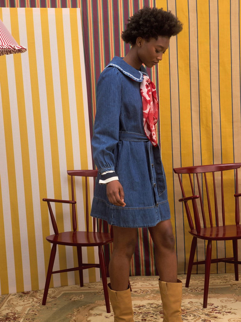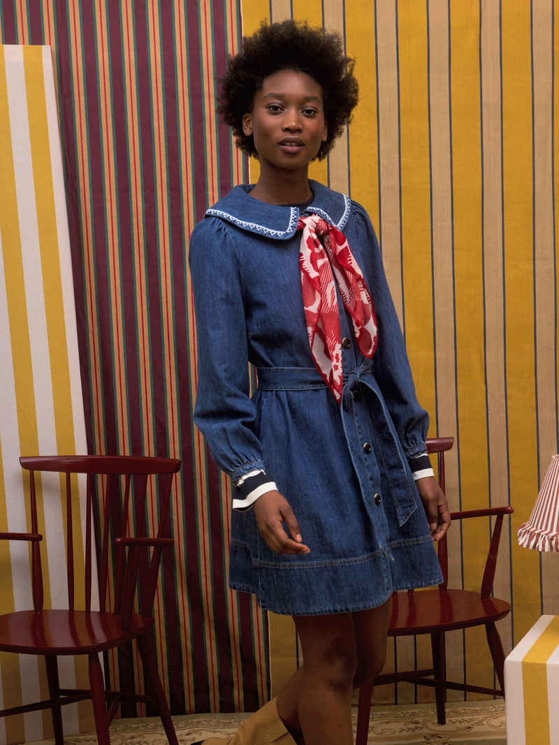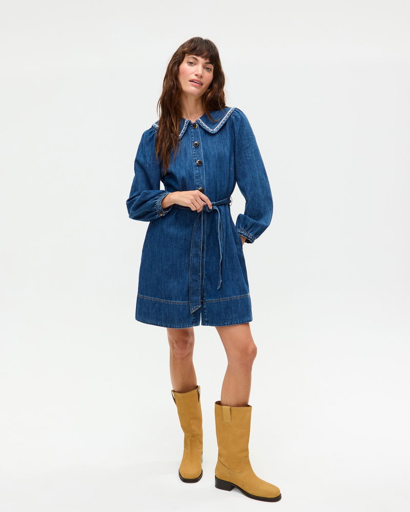 Dark Blue Denim Embroidered Collar Mini Shirt Dress