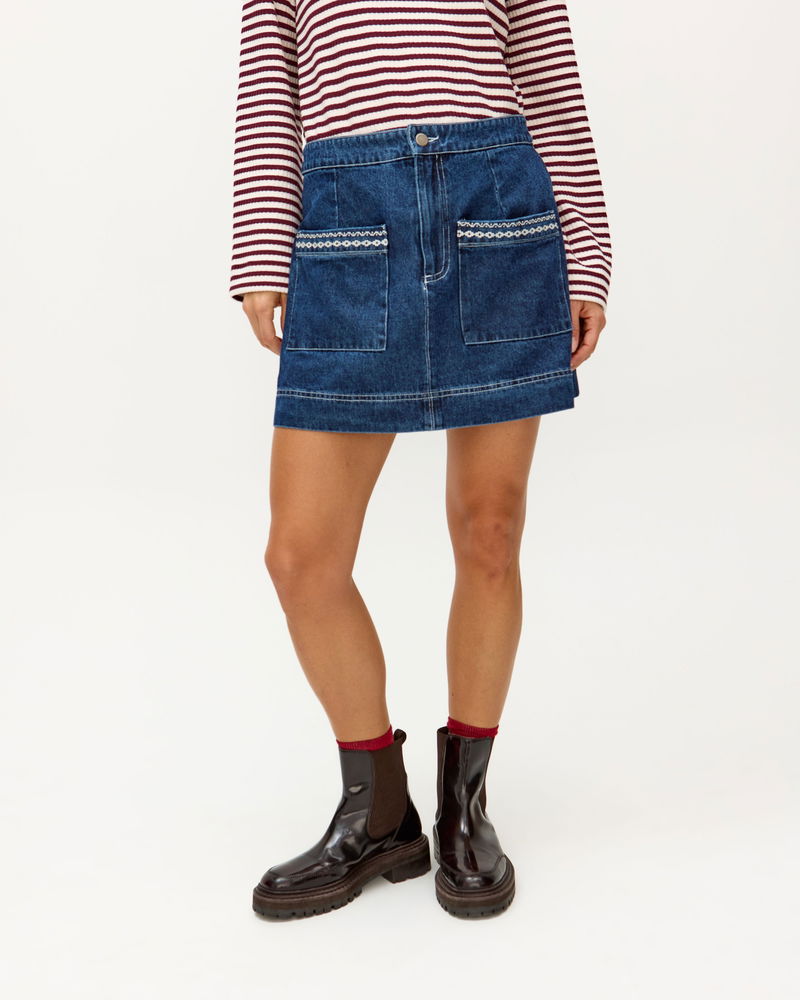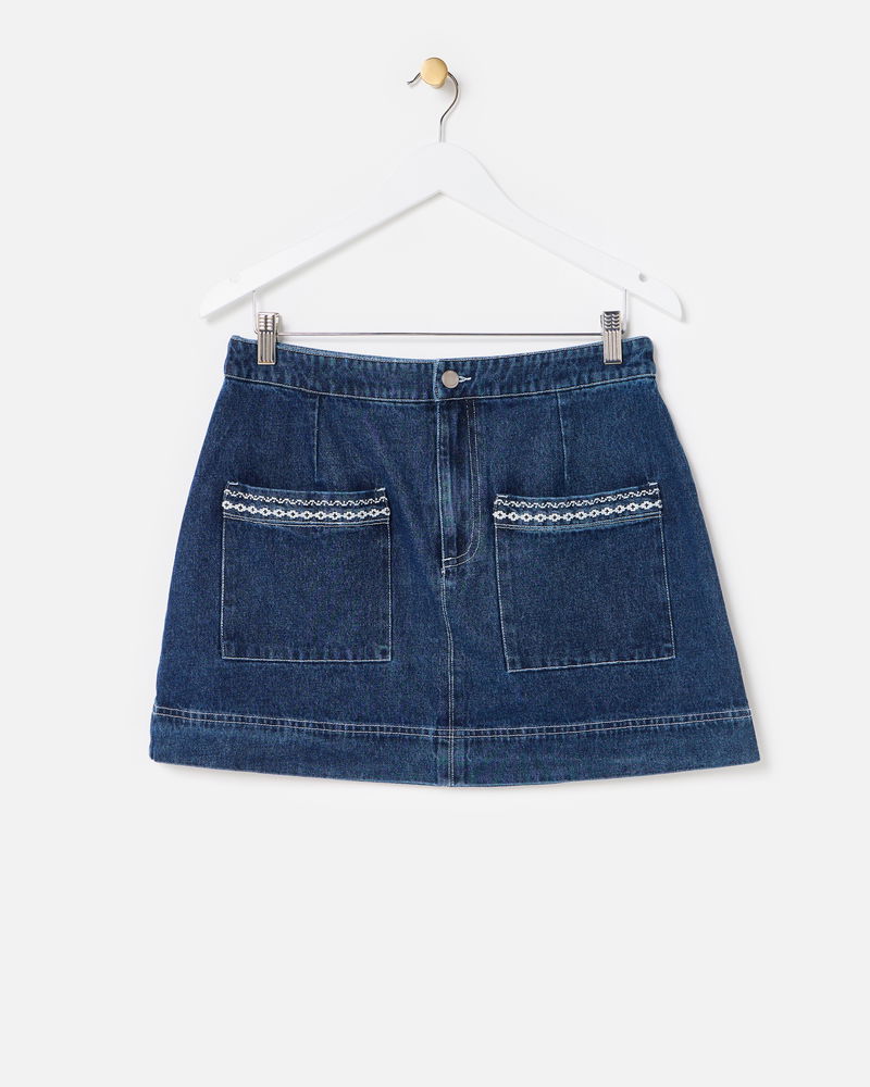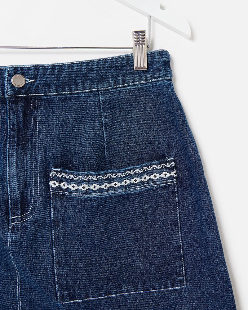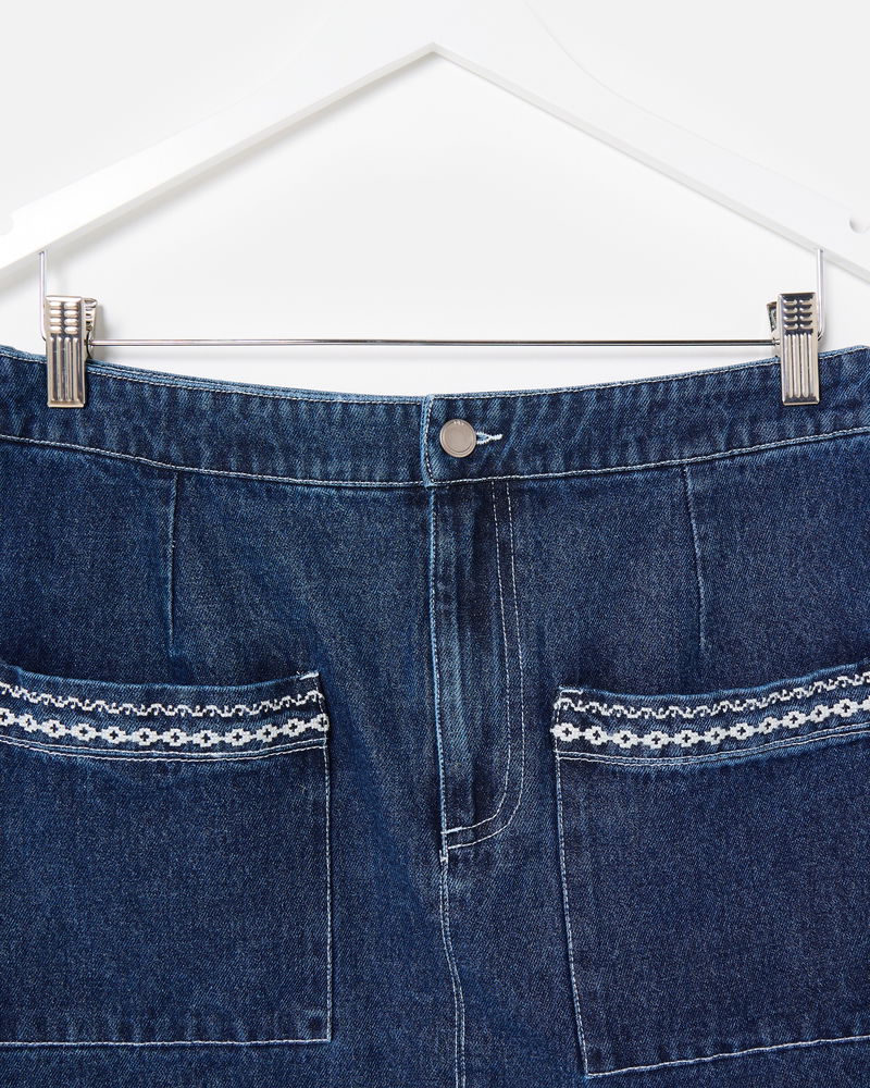 In a dark blue wash, our denim mini skirt features front pockets with contrasting white embroidered details for a playful twist. Designed with an A-line silhouette, style it with a cosy knit and flats, or add tights and boots to take it into the colder months.