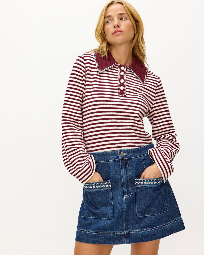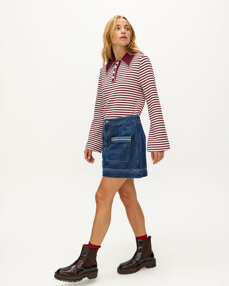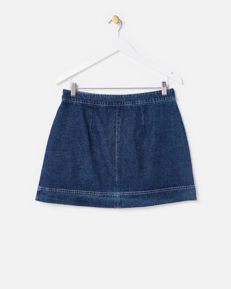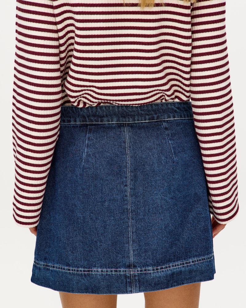 In a dark blue wash, our denim mini skirt features front pockets with contrasting white embroidered details for a playful twist. Designed with an A-line silhouette, style it with a cosy knit and flats, or add tights and boots to take it into the colder months.