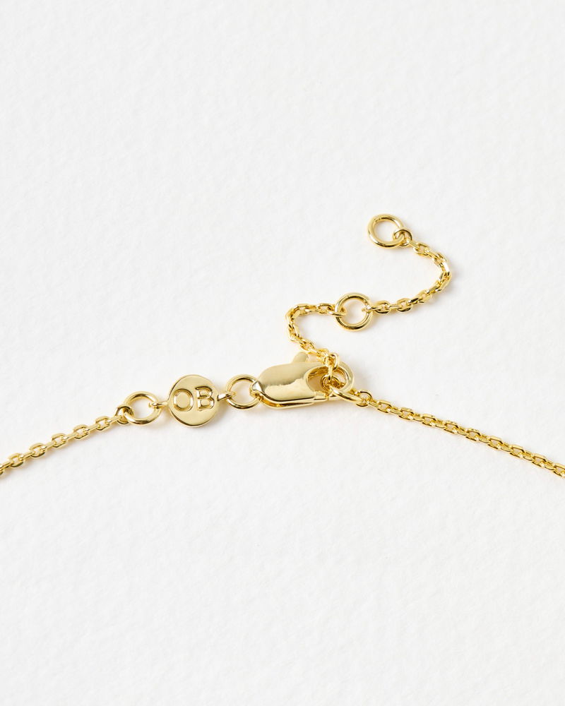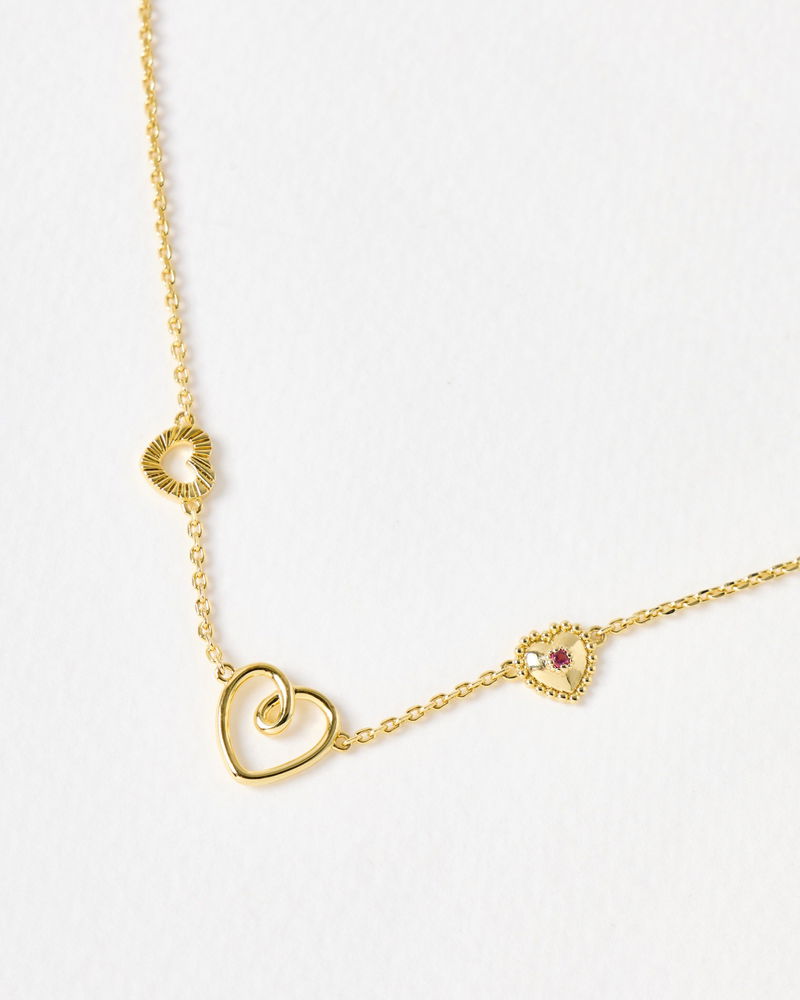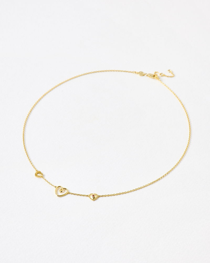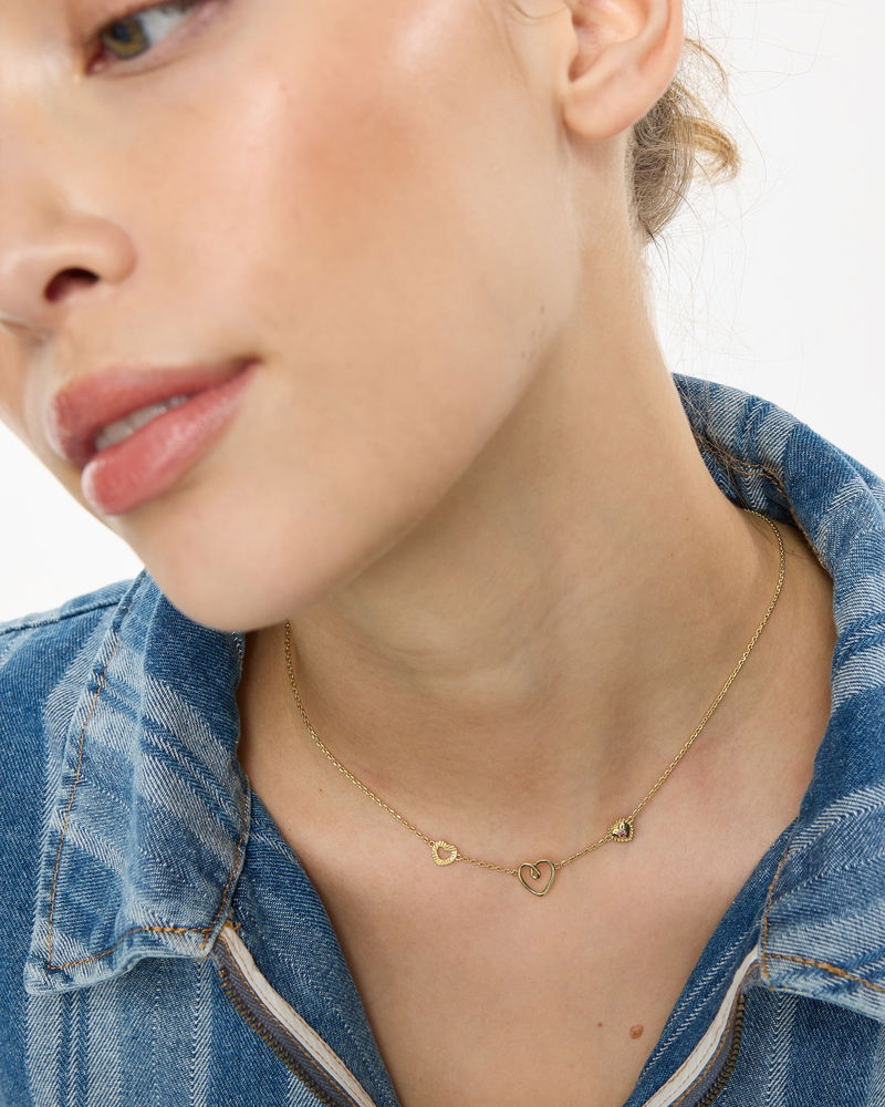 Gold plated necklace with a dainty link chain and high shine finish. We've added three heart charms, one with a looped, cut-out design, one with a engraved, ribbed finish and one with a bobble border and pink tourmaline stone for a pop of colour. Layer with other gold jewellery or heart earrings for a coordinated look.