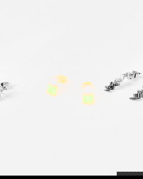 Gold stud earrings with a clear silver stone and purple baguette stone.