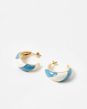 Large gold tone hoop earrings divided by a black enamel stripe, with stud earring backs for ease of wear. These large hoop earrings can be styled for work, or as a statement piece for events and occasions.