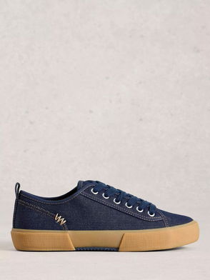 Blue suede trainers with a retro-inspired gum sole and black stripe panels, with gold logo detailing and a pop of fuchsia on the heel.