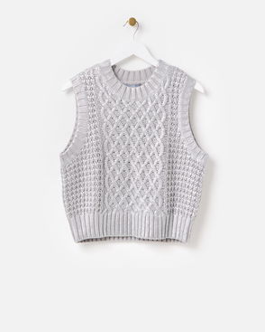 White knitted vest with green embroidered zigzag stripes for added texture, white ribbed trims and relaxed, boxy fit.