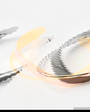 Statement open cuff bangle in a chunky, wavy profile with three separated pieces that merge together for a tapering finish. Made from a gold tone metal, this statement gold bangle is ideal for wedding guest and event styling, and can be stacked alongside other bangles for a textural finish.