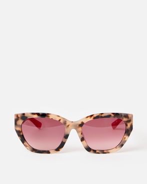 Oversized sunglasses with dark purple tinted lenses, a brown faux tortoiseshell heart shaped frame and matching slim arms.