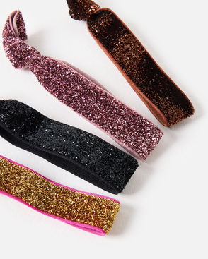 Designed to elevate your everyday hairstyle with a colour pop, playful twist, our set of four knotted elastic hair bands includes a pink velvet band, pink and blue bands with glitter tinsel detailing and an aqua blue band printed with gold pineapple motifs.