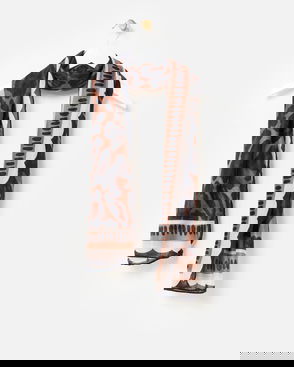 Pleated scarf woven in a red and pink abstract pattern, with subtle gold foil flecks.