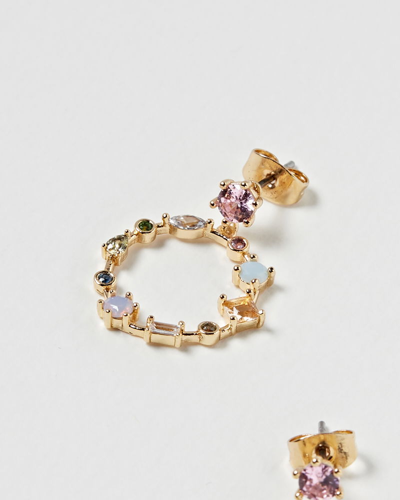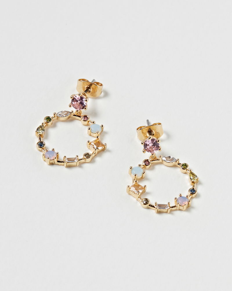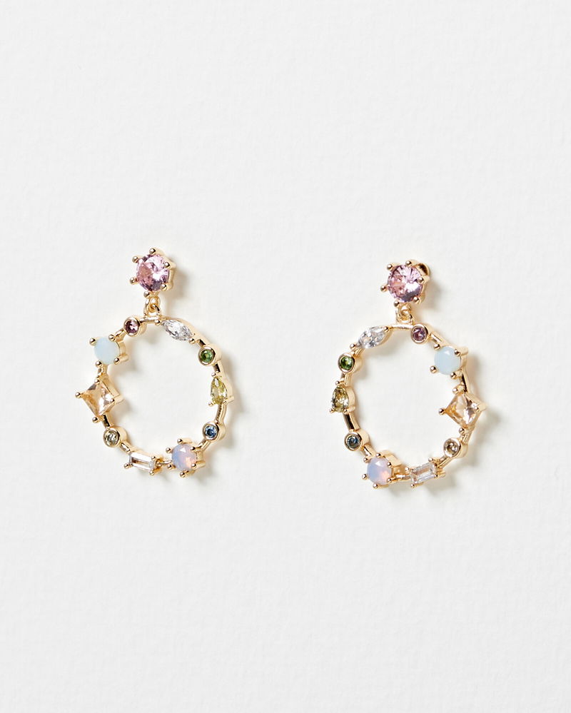 This pair of gold-toned drop earrings features a pink gem which suspends a hoop of multi-coloured jewels, complete with stud backs.