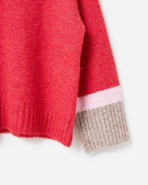 Cobalt blue funnel neck jumper knitted in a plait stitch with ribbed stitches across the hem and cuffs.