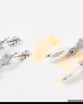 Pair of drop earrings in a gold toned metal, featuring a small oval faux pearl within a textured, organic shaped charm. Style with other pearl jewellery or as part of your earring stack for a summer and occasion-ready look.