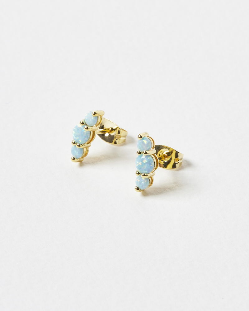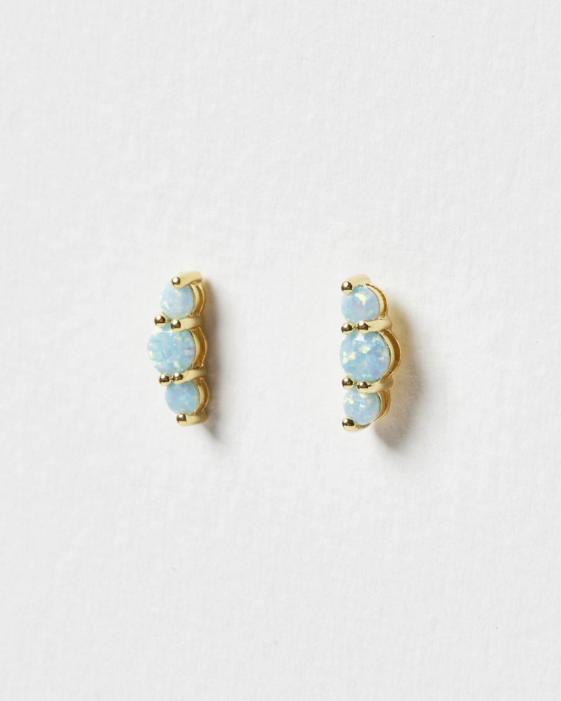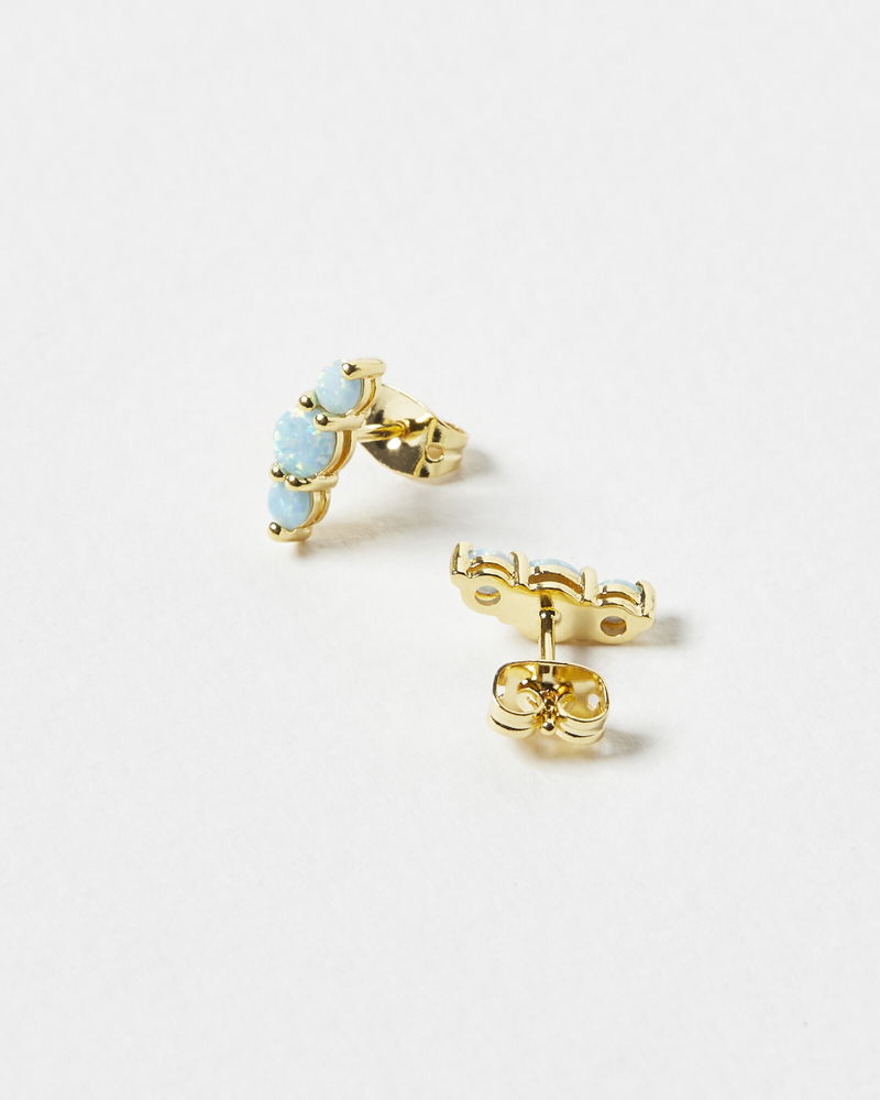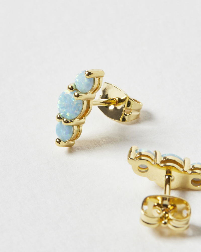 This pair of gold-plated stud earrings feature three semi-precious opal stones placed horizontally, complete with stud backs.