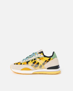 Coral orange suede trainers with a retro-inspired gum sole and white stripe panels, with gold logo detailing and a pop of fuchsia on the heel.