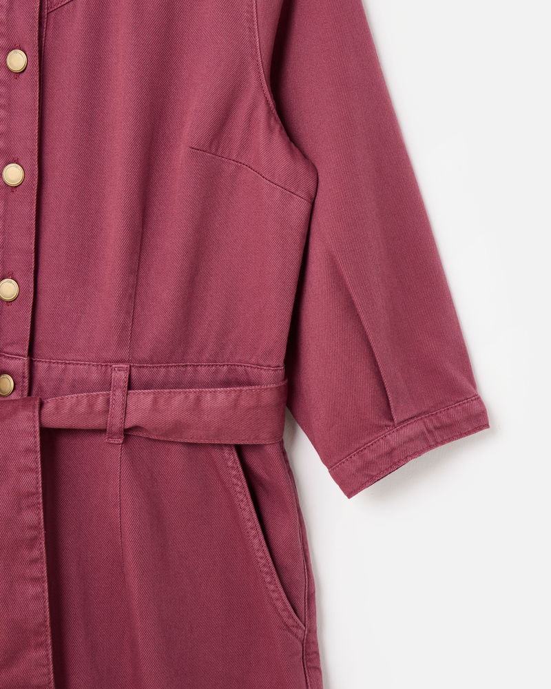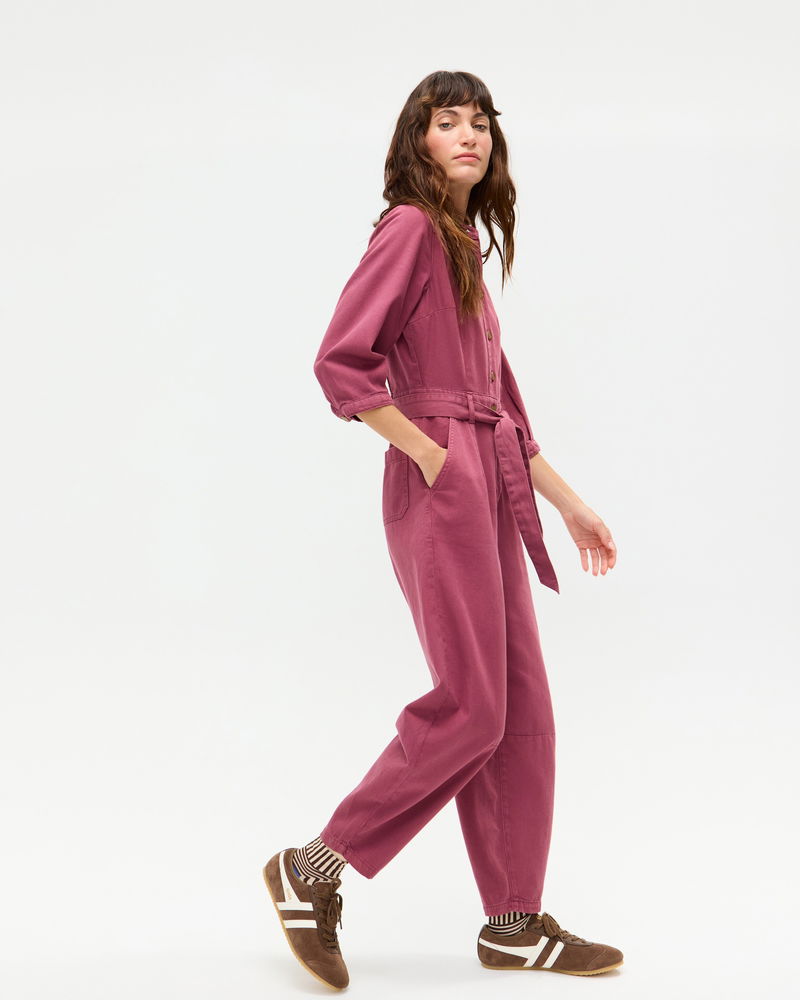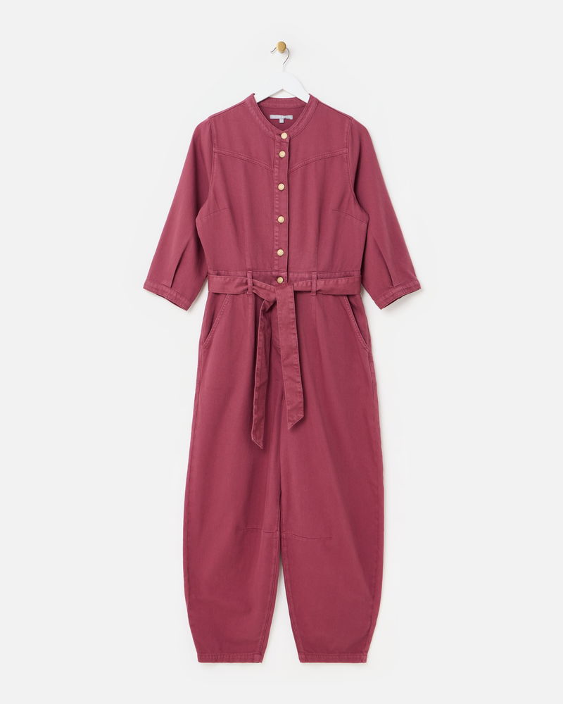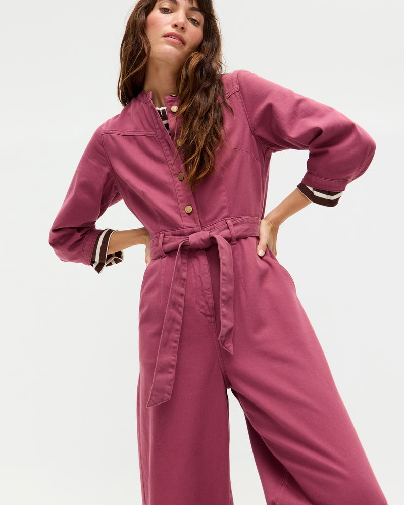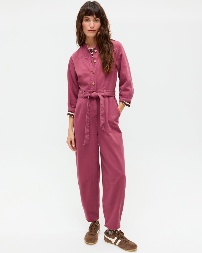 Need a one-and-done outfit that makes a statement without trying too hard? The grape denim jumpsuit brings a refreshing pop of colour to your everyday wardrobe. Designed with a crew neckline and gold-toned buttons, it's complete with a matching tie waist belt and a subtle curved barrel leg fit that tapers at the bottom.