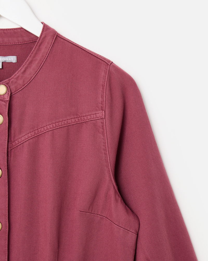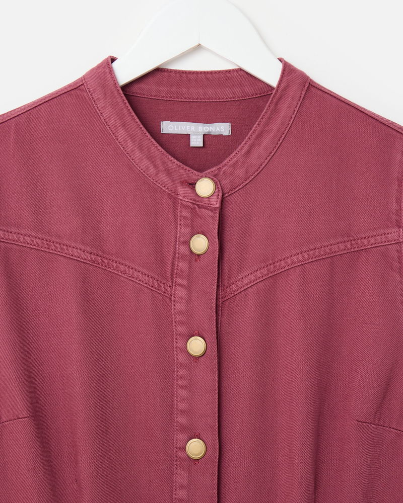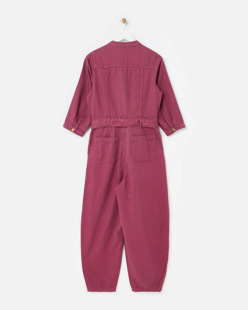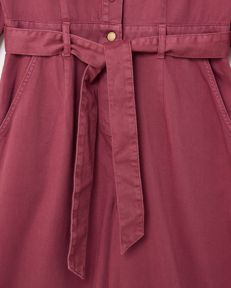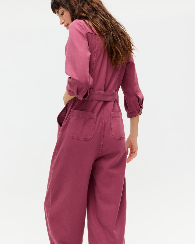 Need a one-and-done outfit that makes a statement without trying too hard? The grape denim jumpsuit brings a refreshing pop of colour to your everyday wardrobe. Designed with a crew neckline and gold-toned buttons, it's complete with a matching tie waist belt and a subtle curved barrel leg fit that tapers at the bottom.