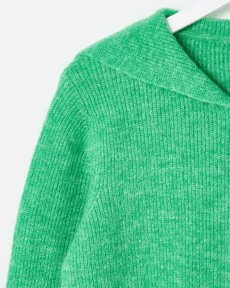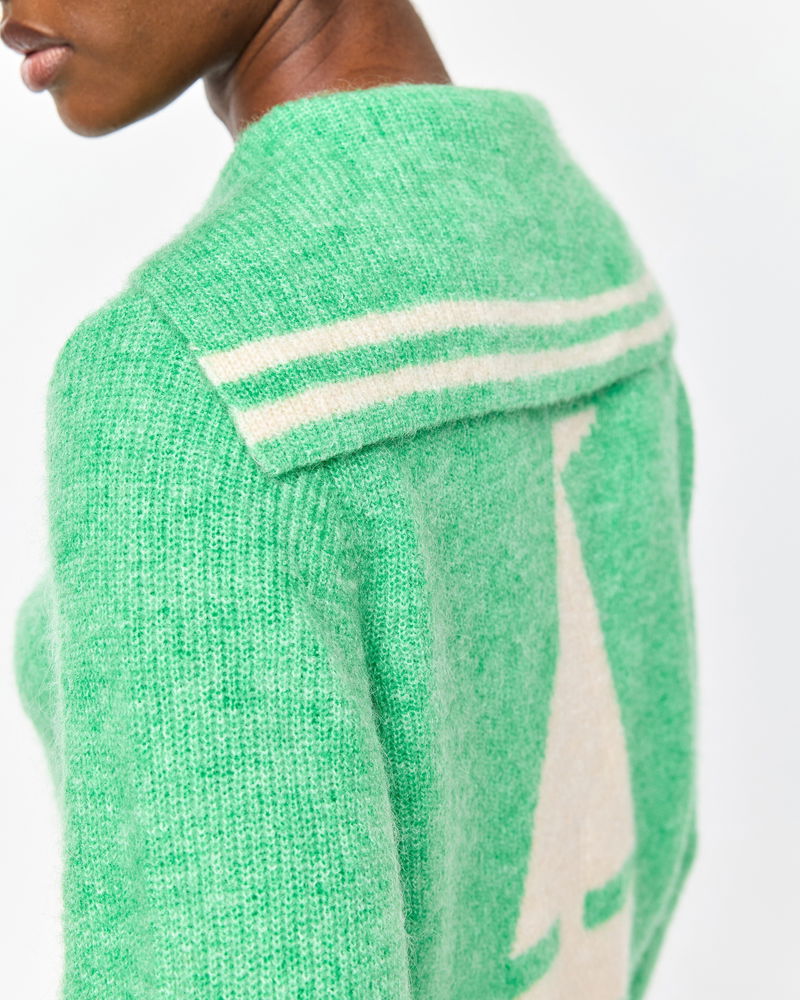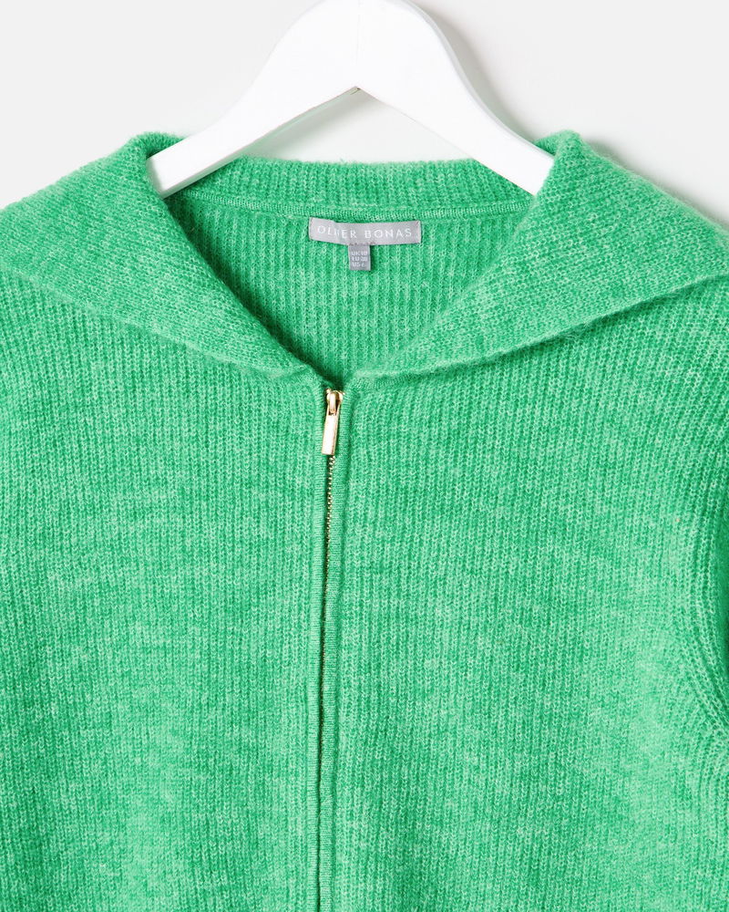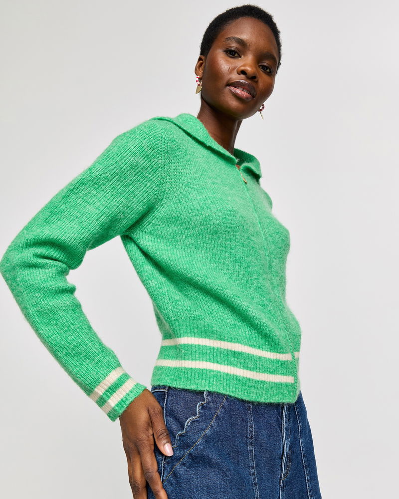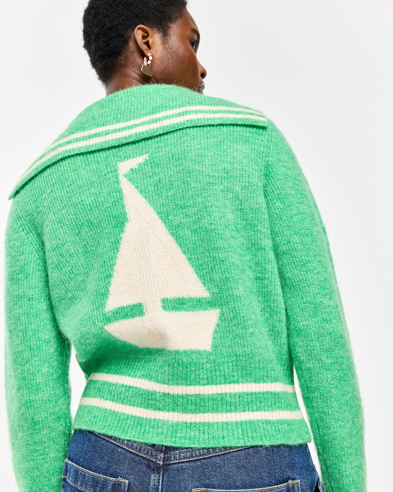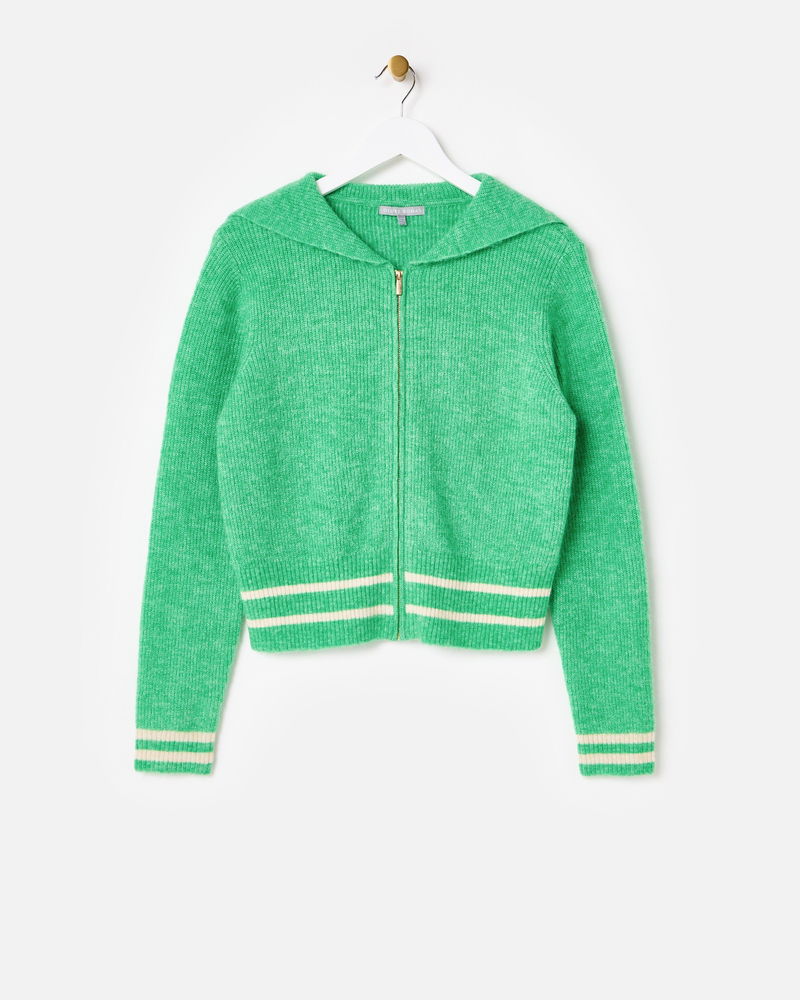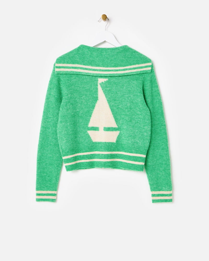 Blending comfort with standout style, our green cardigan is the perfect layer to your everyday outfits. Designed with a gold zip, ribbed trims and an oversized collar, wear it zipped up or open over dresses or T-shirts. Complete with cream striped trims and a boat motif on the back, it's a go-to piece for transitional dressing.