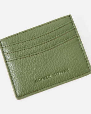 In a rectangular profile, the Greta card holder sits in a vivid green hue with pastel and metallic card sleeves. Complete with golden metalware, open to reveal a contrasting purple lining.