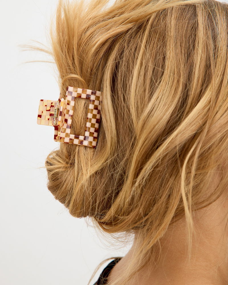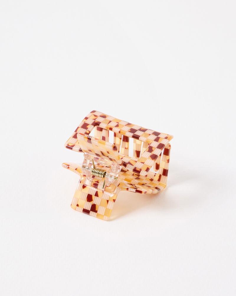 Keep your hair in check with our resin claw clip, designed with a brown, pink and white striped chequerboard pattern and cut-out shape.
