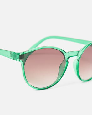 White iridescent sunglasses with gold metal arms and faux marble pattern.