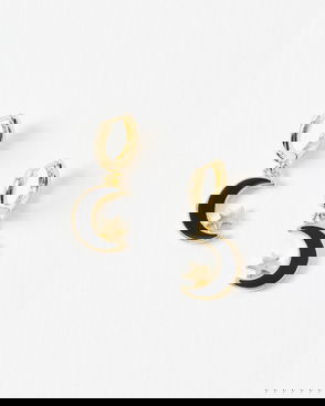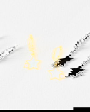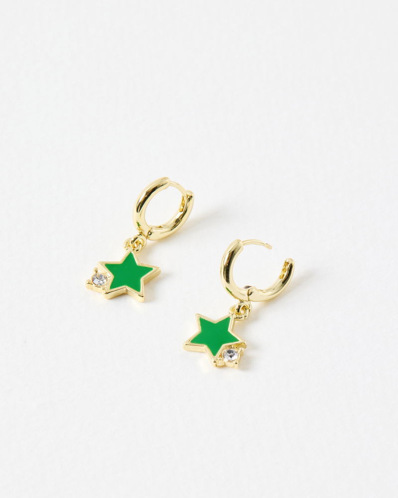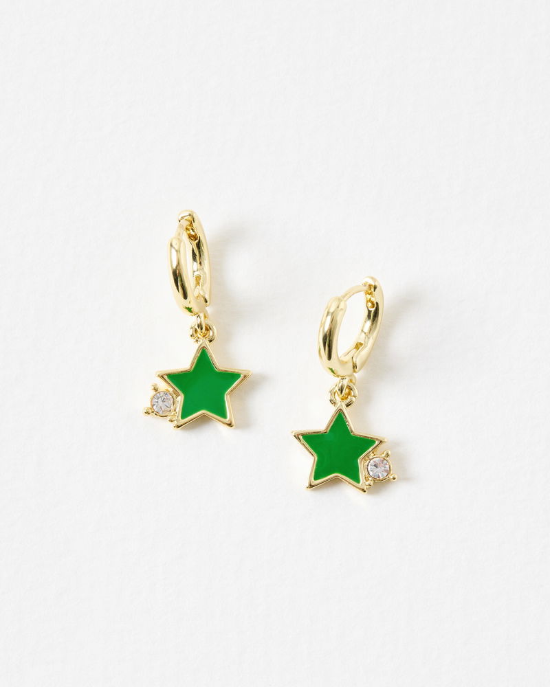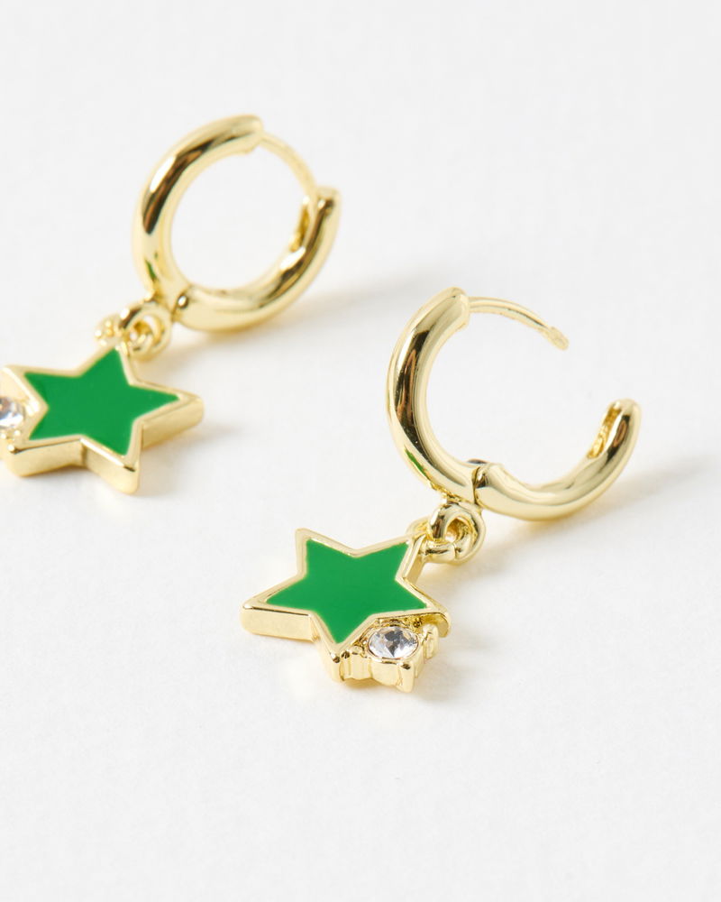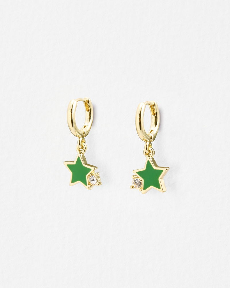 These celestial-themed gold-colour huggie earrings suspend small star charms with a green inlay and clear round stone to the side.