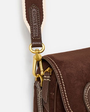 Orange crossbody bag with a double zipped pocket design, gold hardware and a black woven strap, with alternative matching slim strap tucked inside.