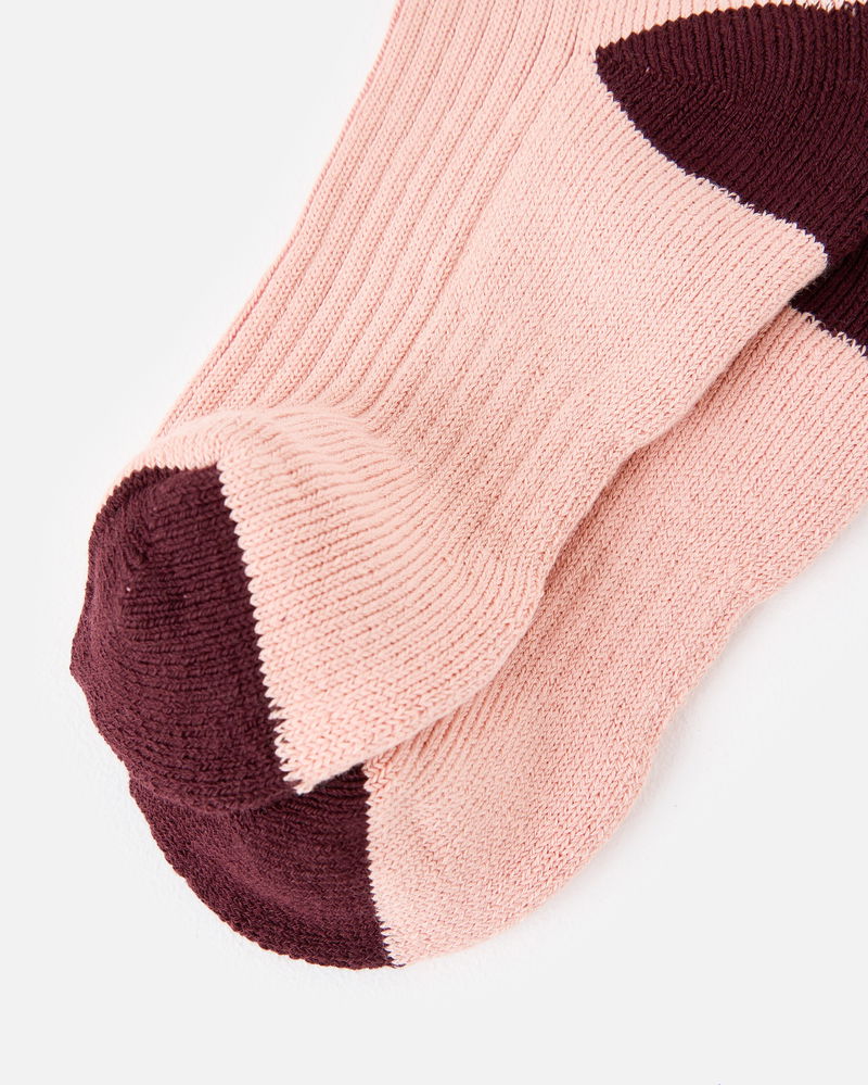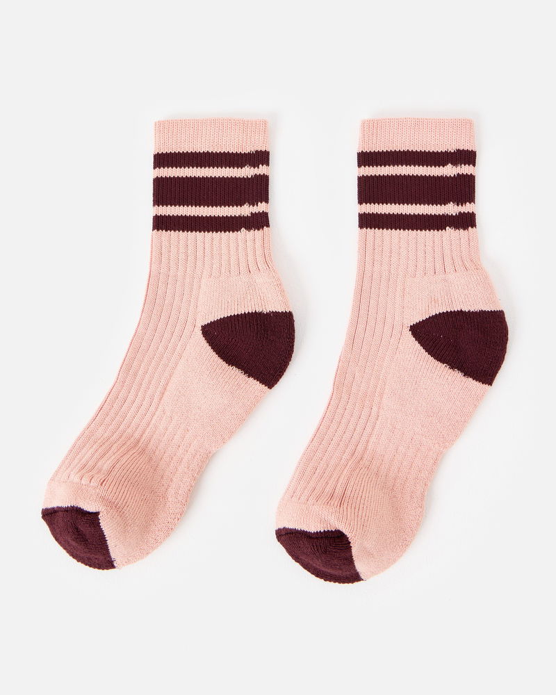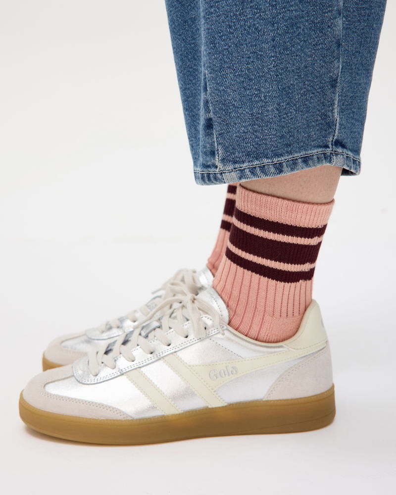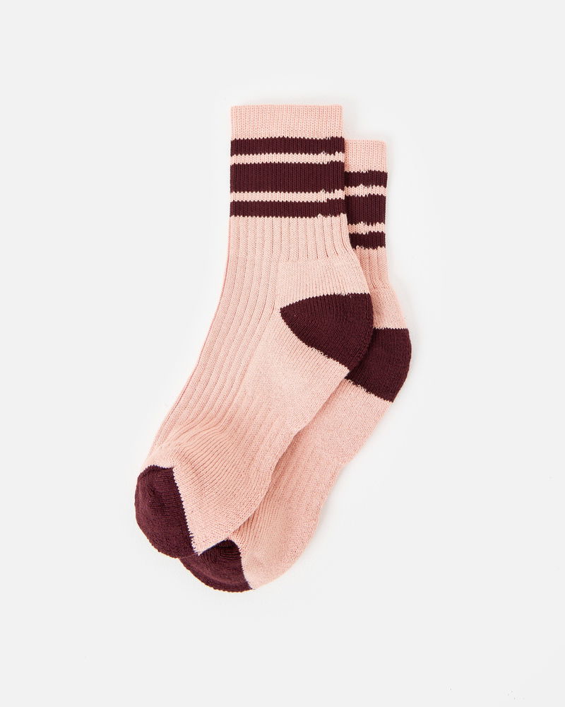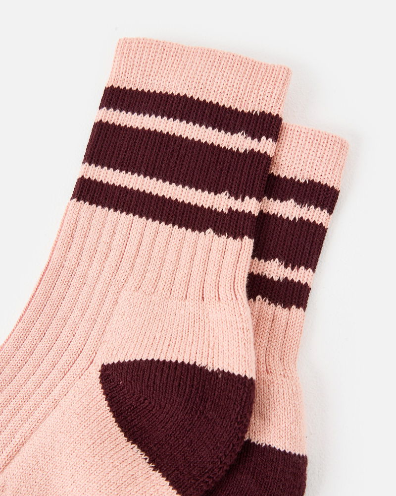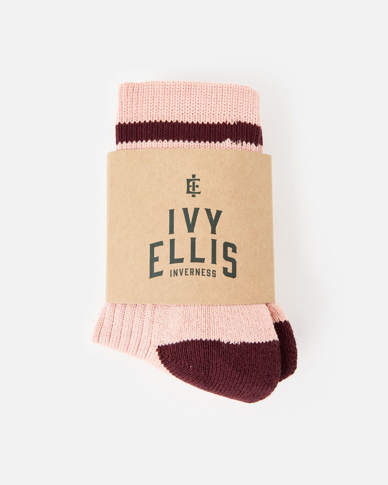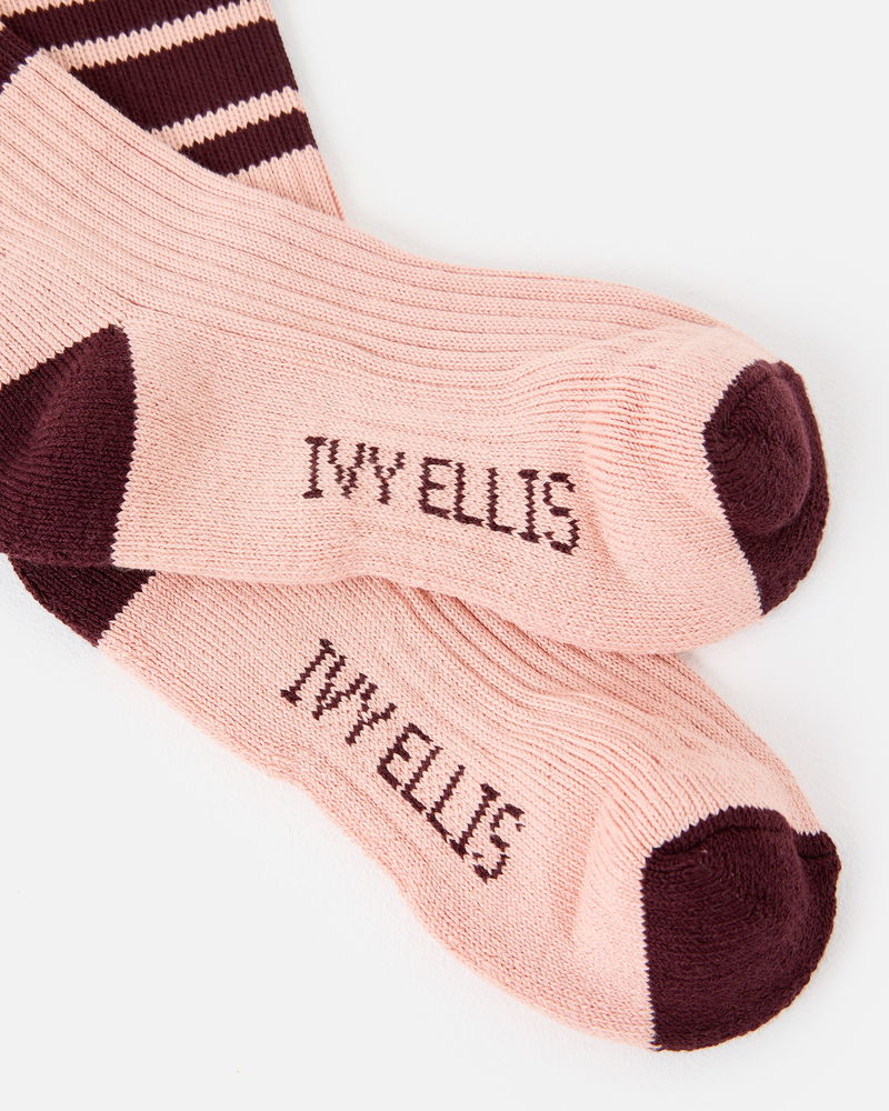Crafted from a soft cotton blend, these rose pink Ivy Ellis socks feature solid wine red toes and heels and a striped trim. Complete with a gently elasticated top for a secure, comfortable fit, they bring an effortless touch of athleisure to your outfit.