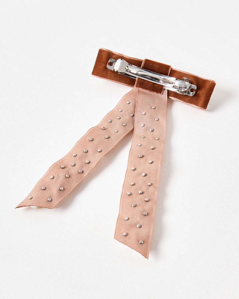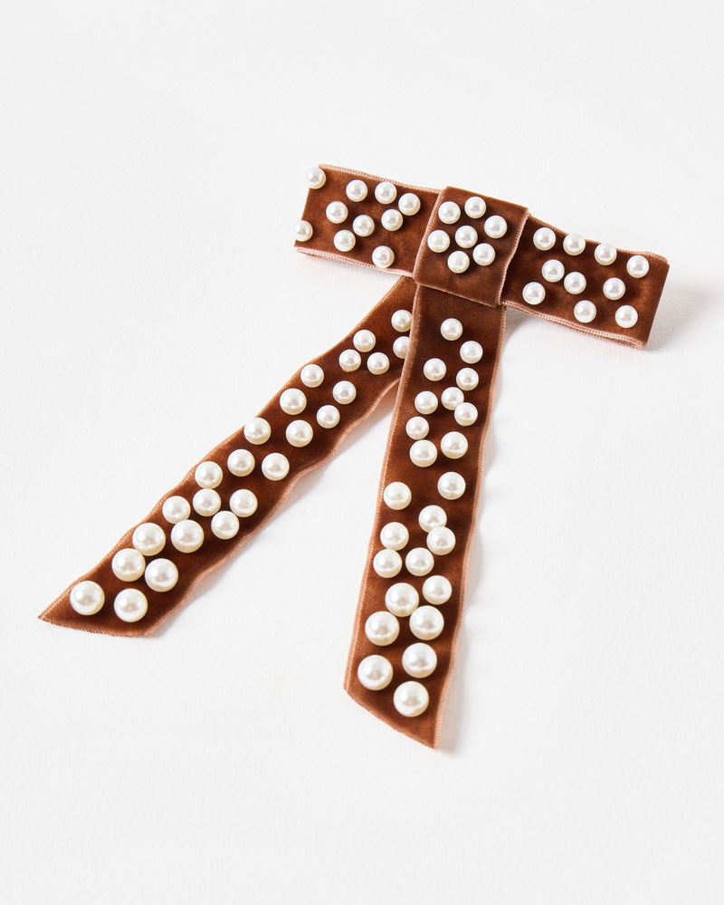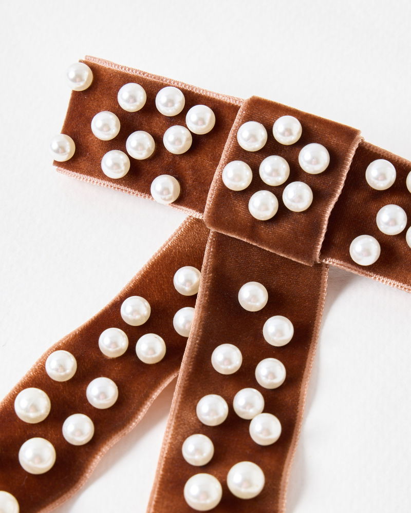 Elegance be yours with our chic chocolate-brown velvet bow decorated with faux pearl beads. Its silver-toned clip slides easily into both updos and down-dos.