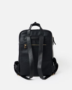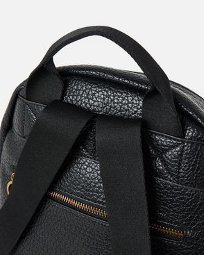Neutral ecru rucksack with three exterior zipped pockets, elastic water bottle pouches and a contrasting black trim on the zip tassels.