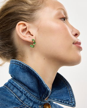 Gold toned hoop earrings with green and yellow striped enamel inlay, and a central green stone feature surrounded by multiple clear stones. Finished with a stud earring back for comfortable wear. Style with a green necklace or accessories to tie in with the rest of your look.