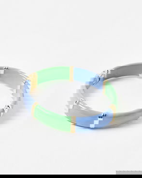 Chunky gold tone bangle with a green resin inlay and shiny pink gems.