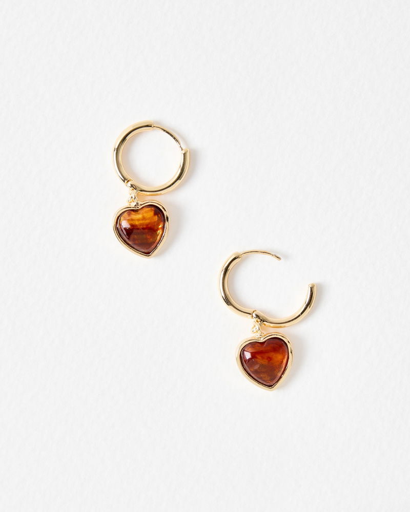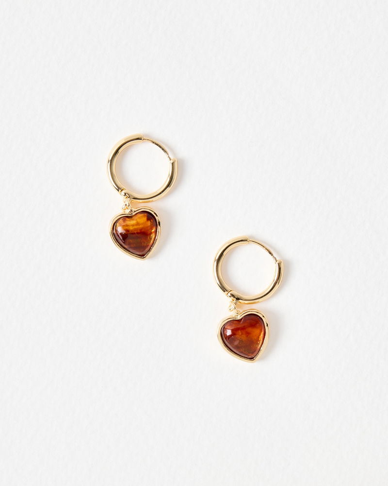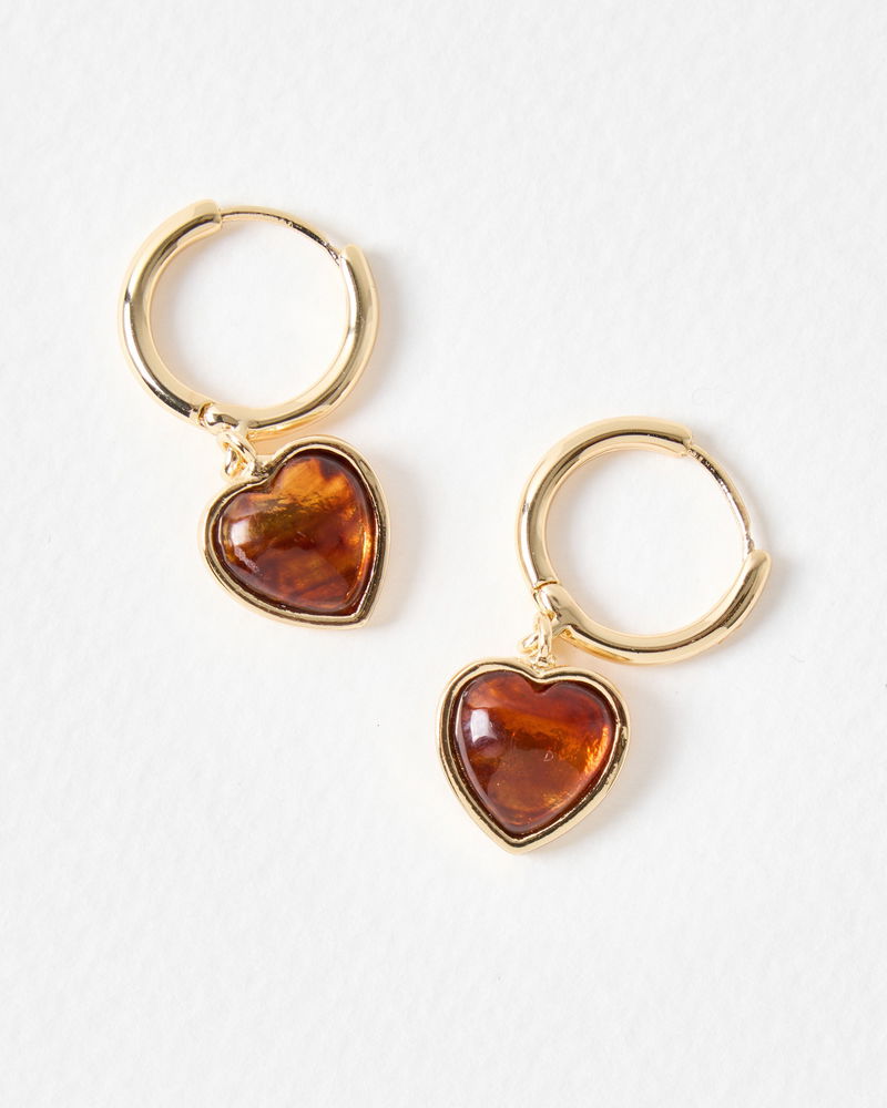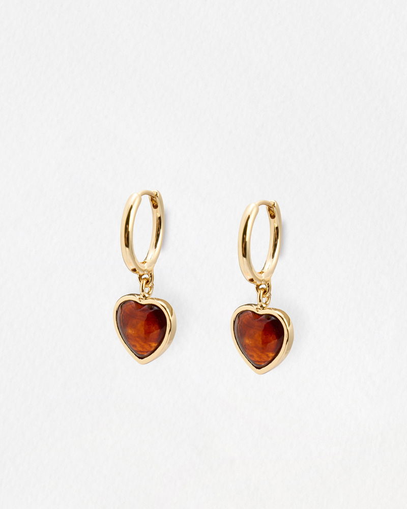 Designed with an easy-to-wear clicker back and gold tone hoop, these drop earrings suspend a brown resin heart charm that hangs just below the lobe. Wear with other heart jewellery for co-ordinated styling.