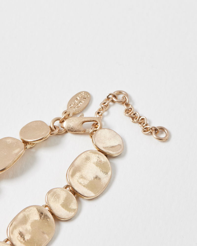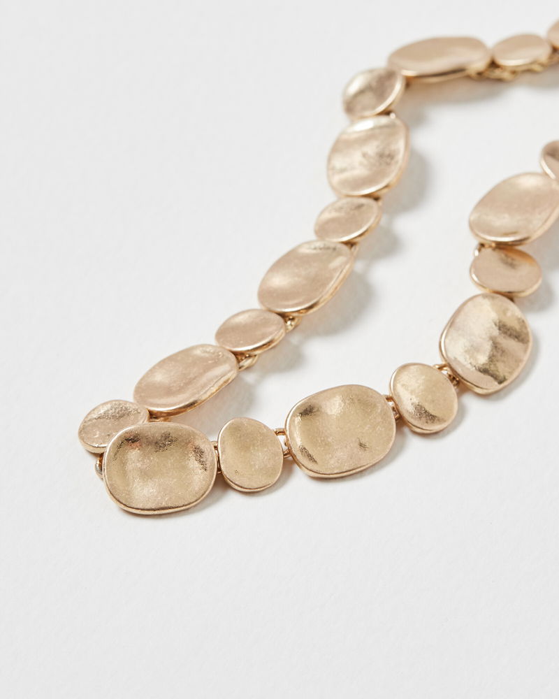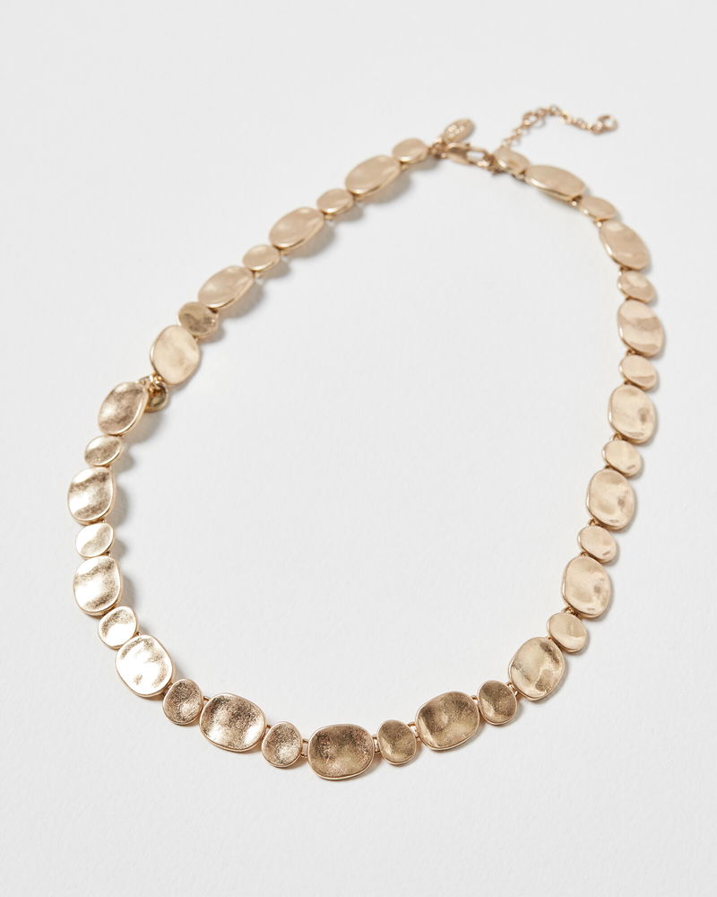 In a matte, hammered metal finish, this statement necklace features a gold-toned pebble link design, threaded through a fine chain, finished with a lobster clasp fastening.