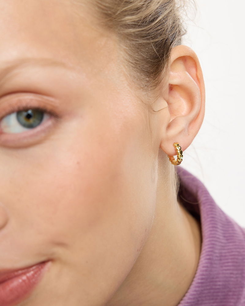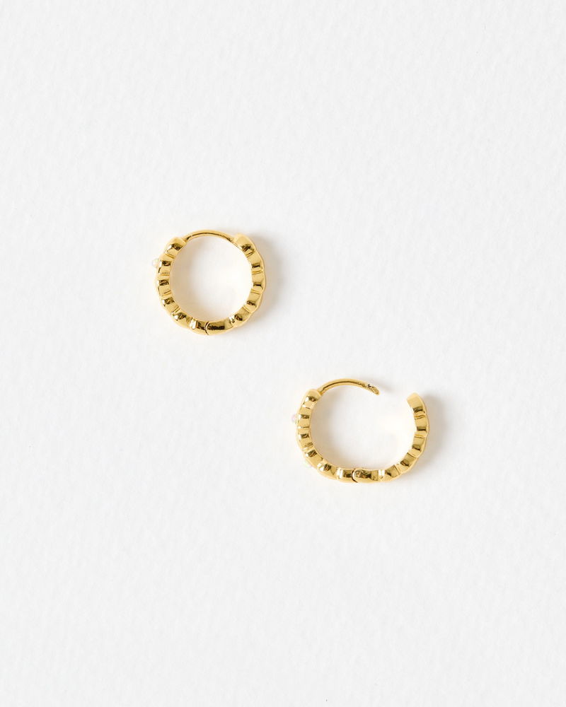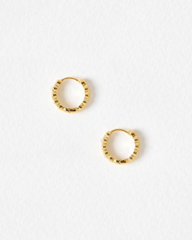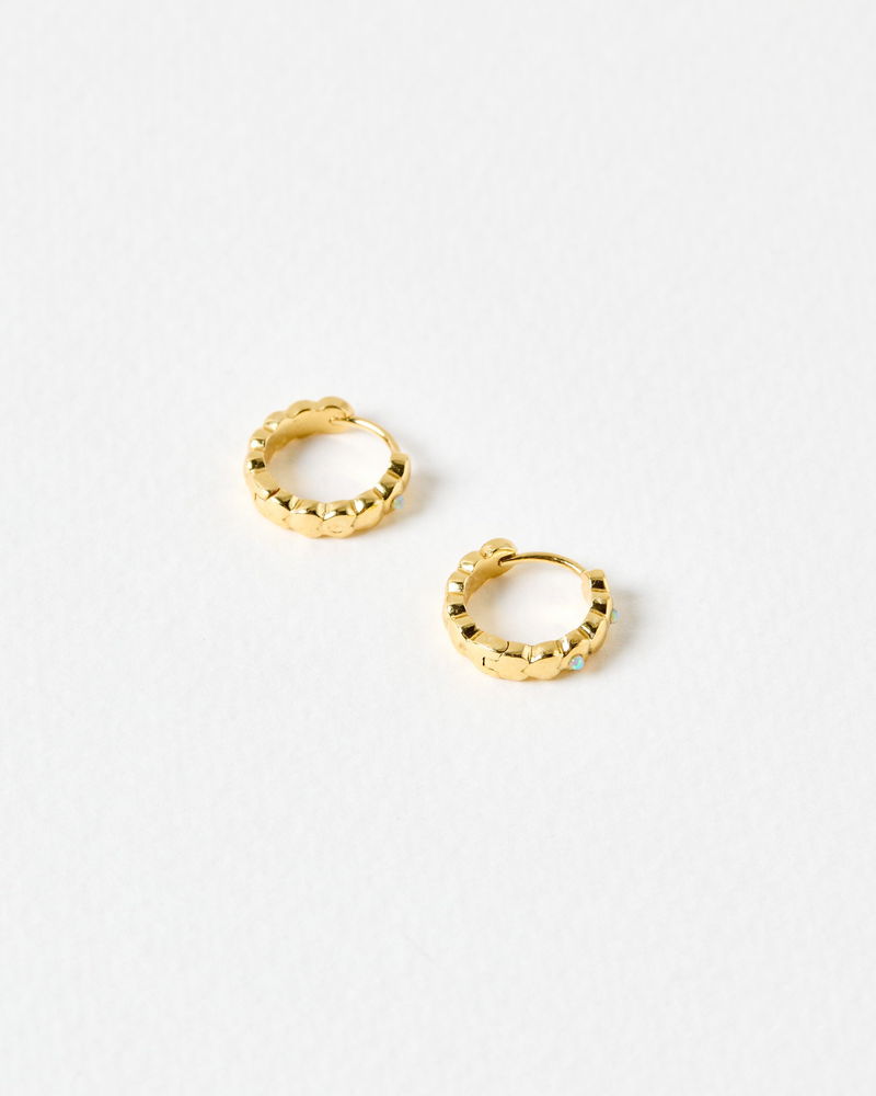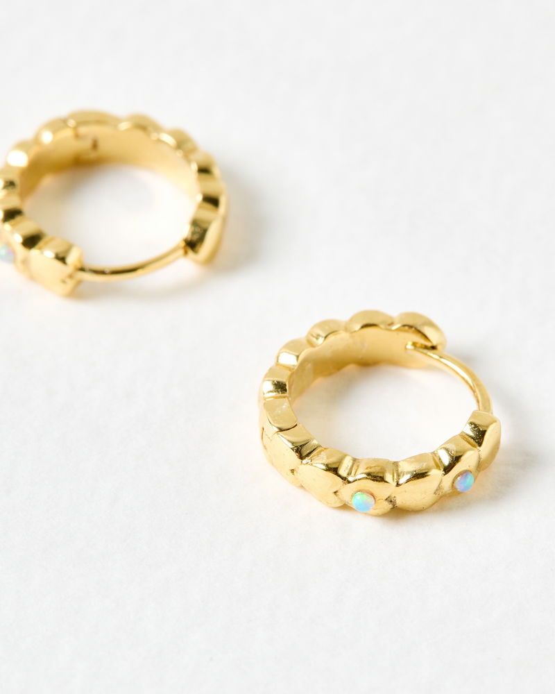 Gold plated hoop earrings made from a row of tiny hearts. They've added tiny blue opalite stones for extra sparkle, and an easy clicker back for everyday wear.