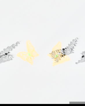 Set of four ocean-inspired stud earrings, featuring a pair of small shell stud earrings, and a pair of jellyfish earrings with tiny arms that dangle beneath the lobe. Both pairs of stud earrings are decorated all over with tiny clear cubic zirconia inlays, set in a gold tone metal base. Wear together to form a summer earrings stack for holiday and beach-ready looks, or mix and match with other stud earrings and gold jewellery pieces to suit your personal style.