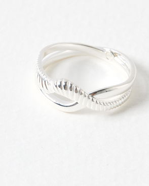 Sculptural silver plated ring made from two textured panels that curve and meet in the centre.