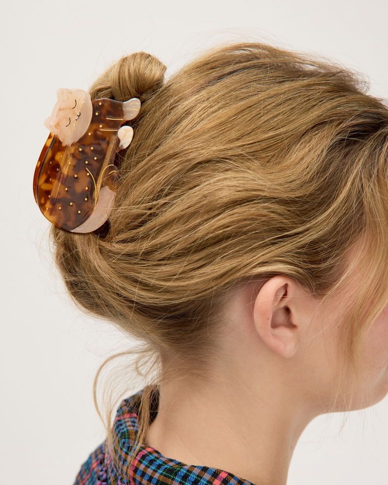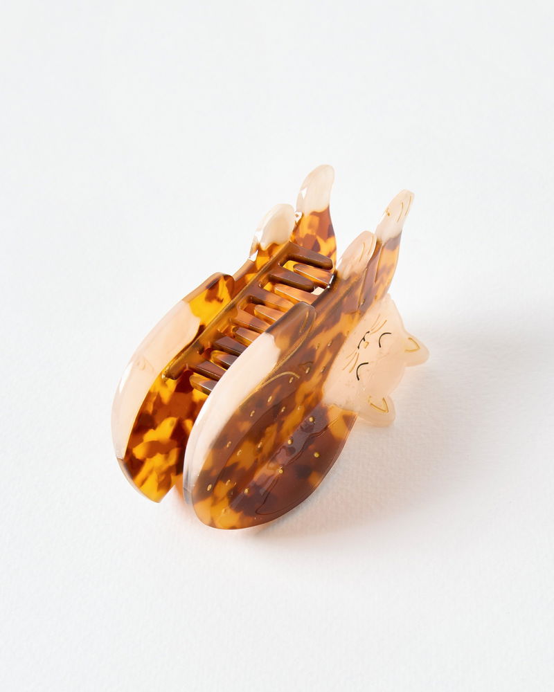 In a brown faux tortoiseshell pattern, we've designed the claw clip in a fun cat design with gold logo etched detailing for a touch of shimmer.