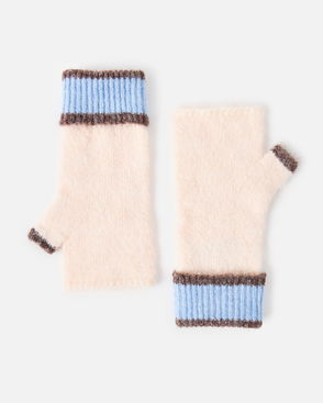 Long, fluffy wrist warmers knitted in an light blue marl.