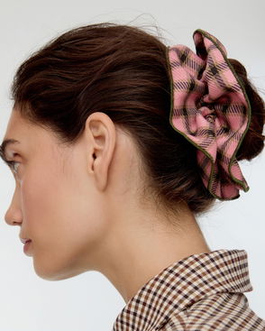 Large scrunchie printed in a pink and cream checked gingham pattern with a red trim.