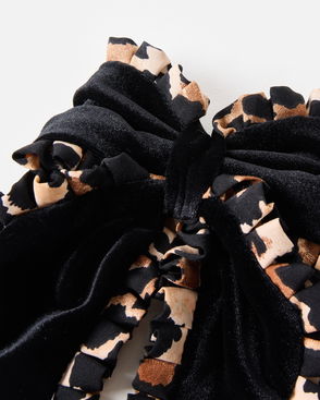 Black velvet hair bow embellished with coloured gems and faux pearls.