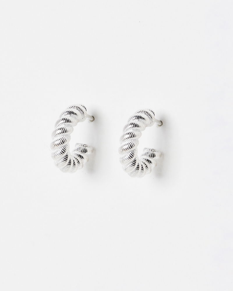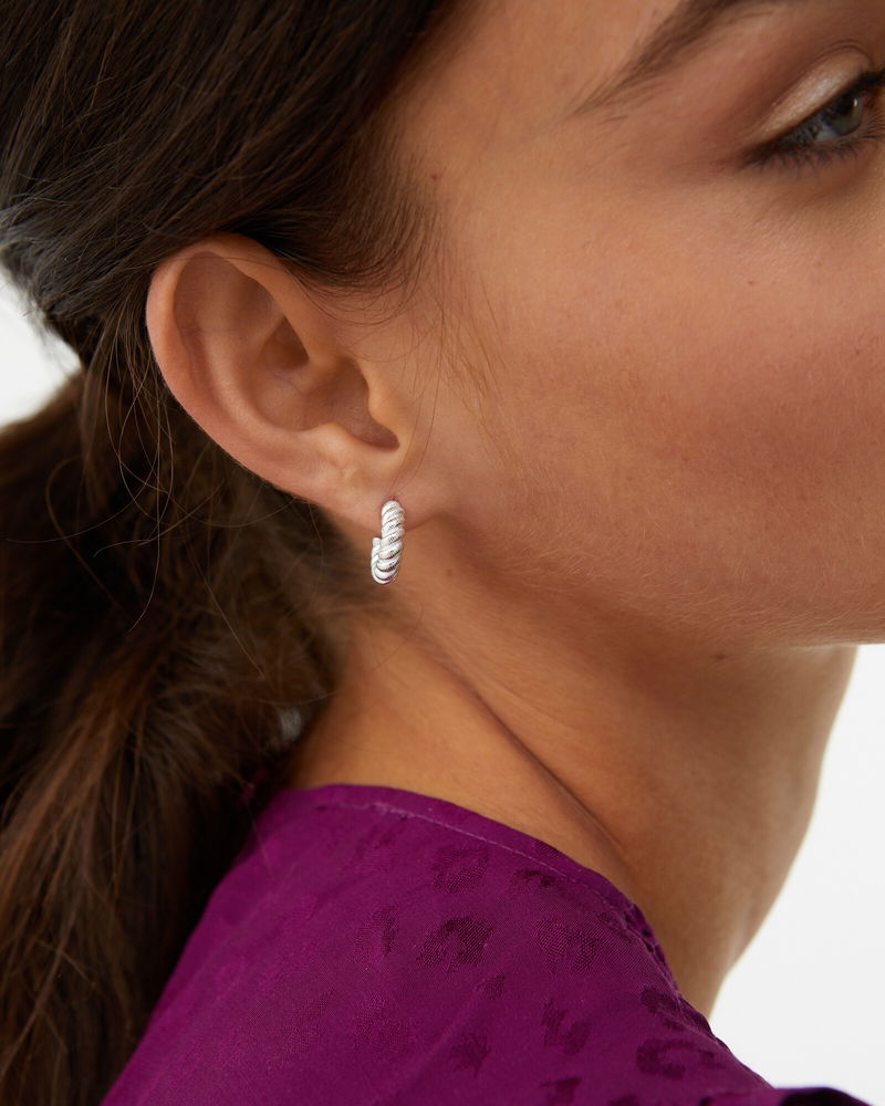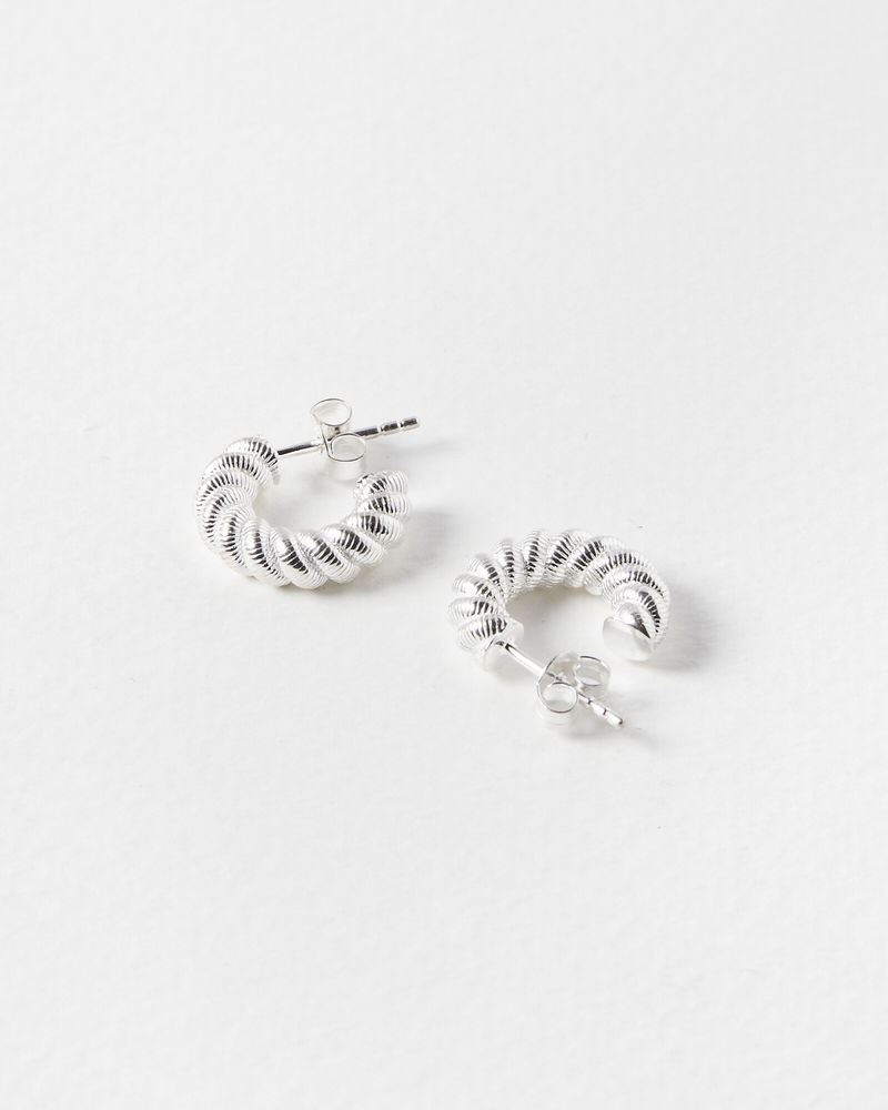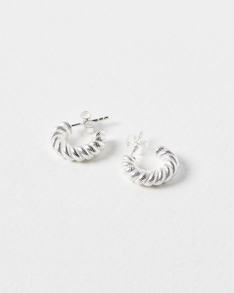 Finished in a glossy sterling silver, these hoop earrings have a twisted silhouette with engraved details and are suspended from stud backs.