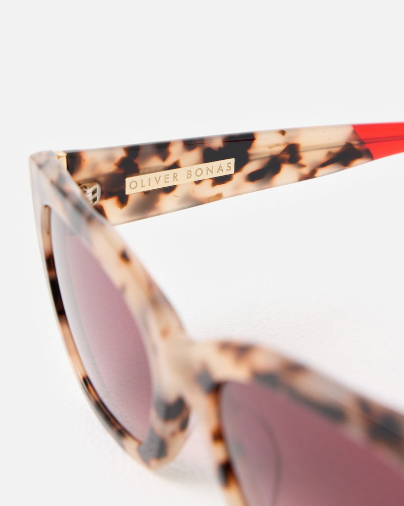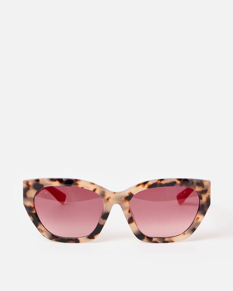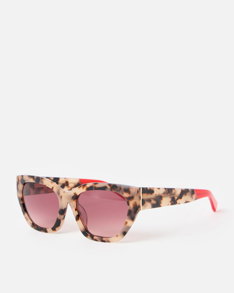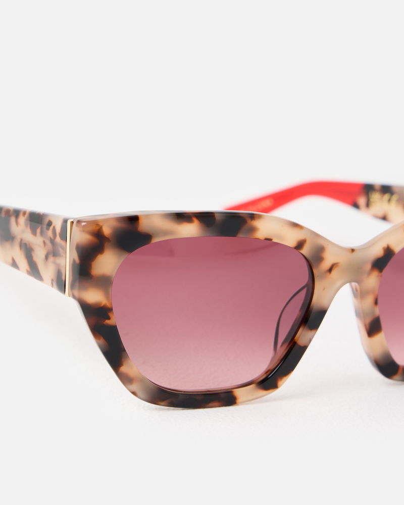 Designed with brown tinted lenses to beat the glare and accented with a milky brown faux tortoiseshell frame, our angled cat eye sunglasses are perfect for everyday summer styling. With matching arms featuring a bold red tip, they even come with their own gold case so they're easy to find in your summer tote.