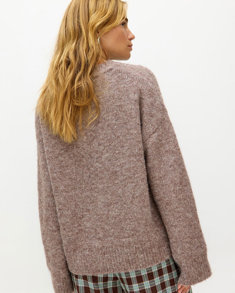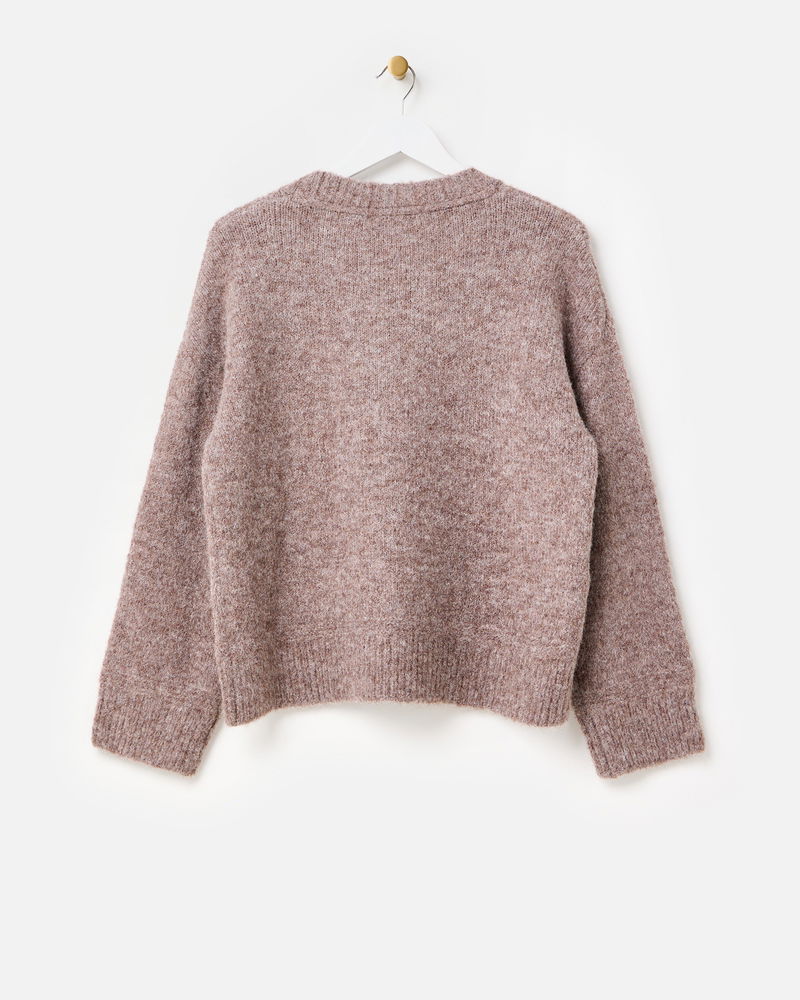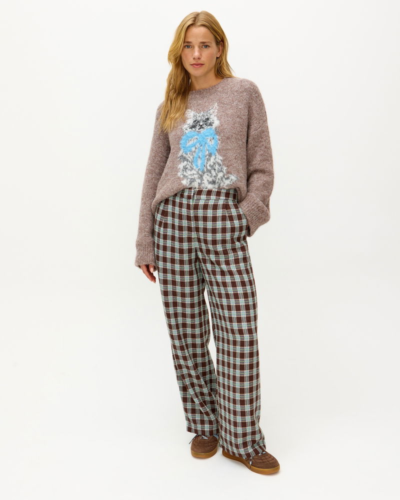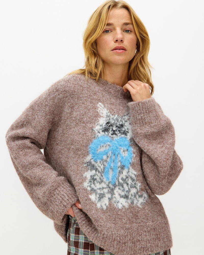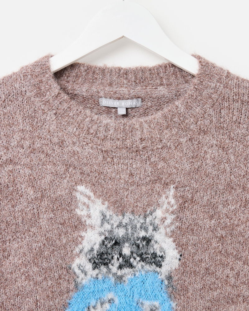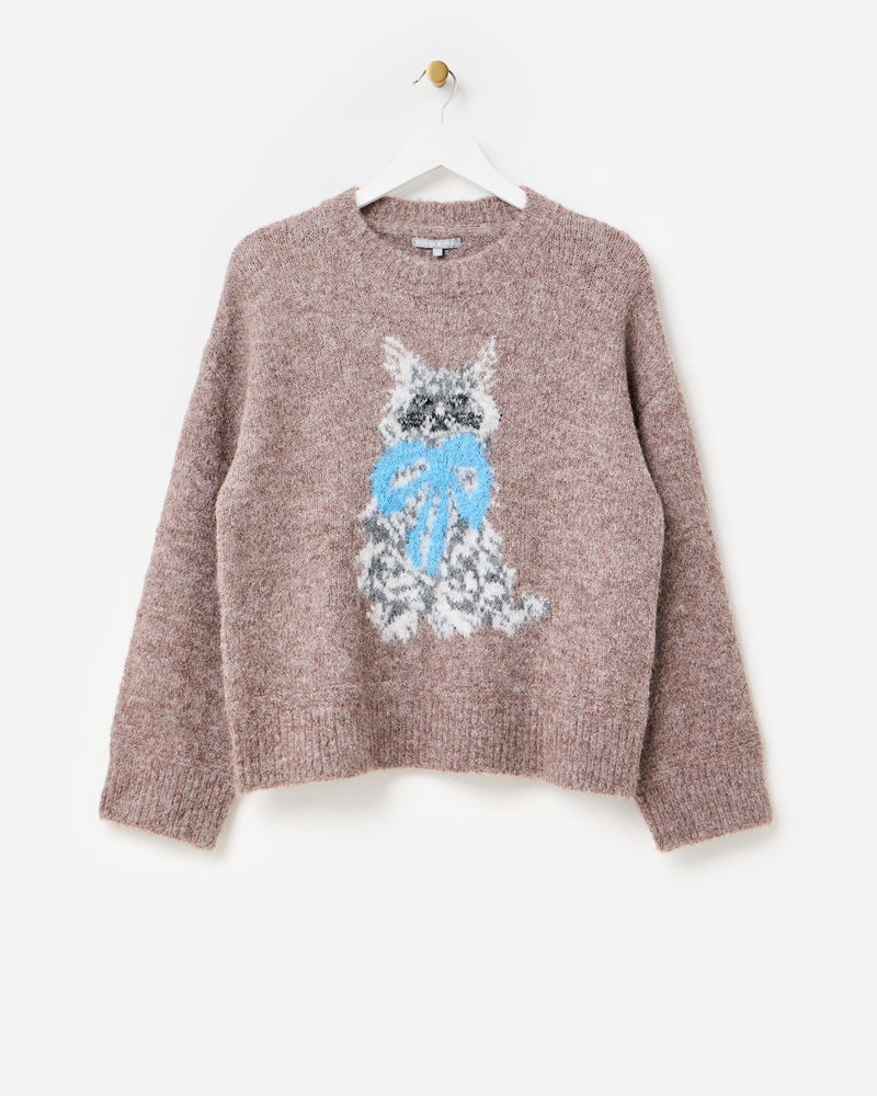 For the cat lovers who just can't get enough, our mocha brown jumper is a must-have for your cold-weather wardrobe. Knitted with a white and grey cat character wearing a blue bow collar, designed in the OB creative studios, it features a crew neckline and ribbed trims. Layer over a shirt or wear solo with a pair of trousers and flats for a versatile everyday look.